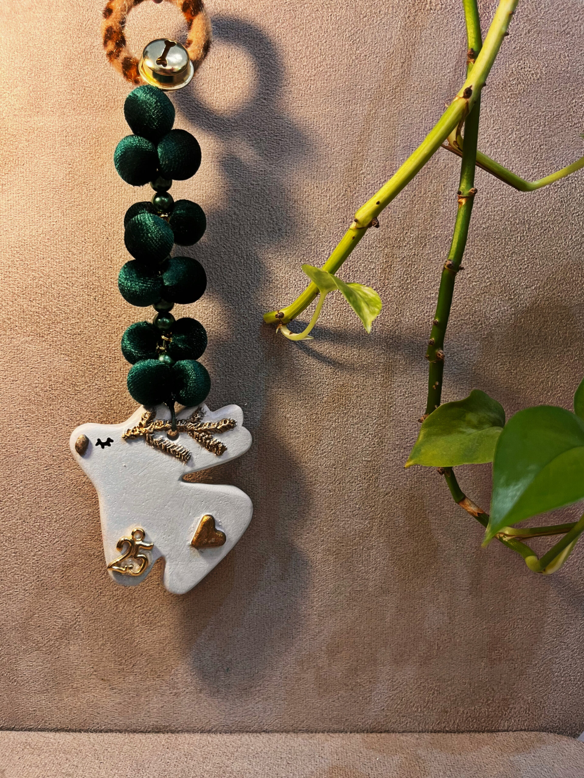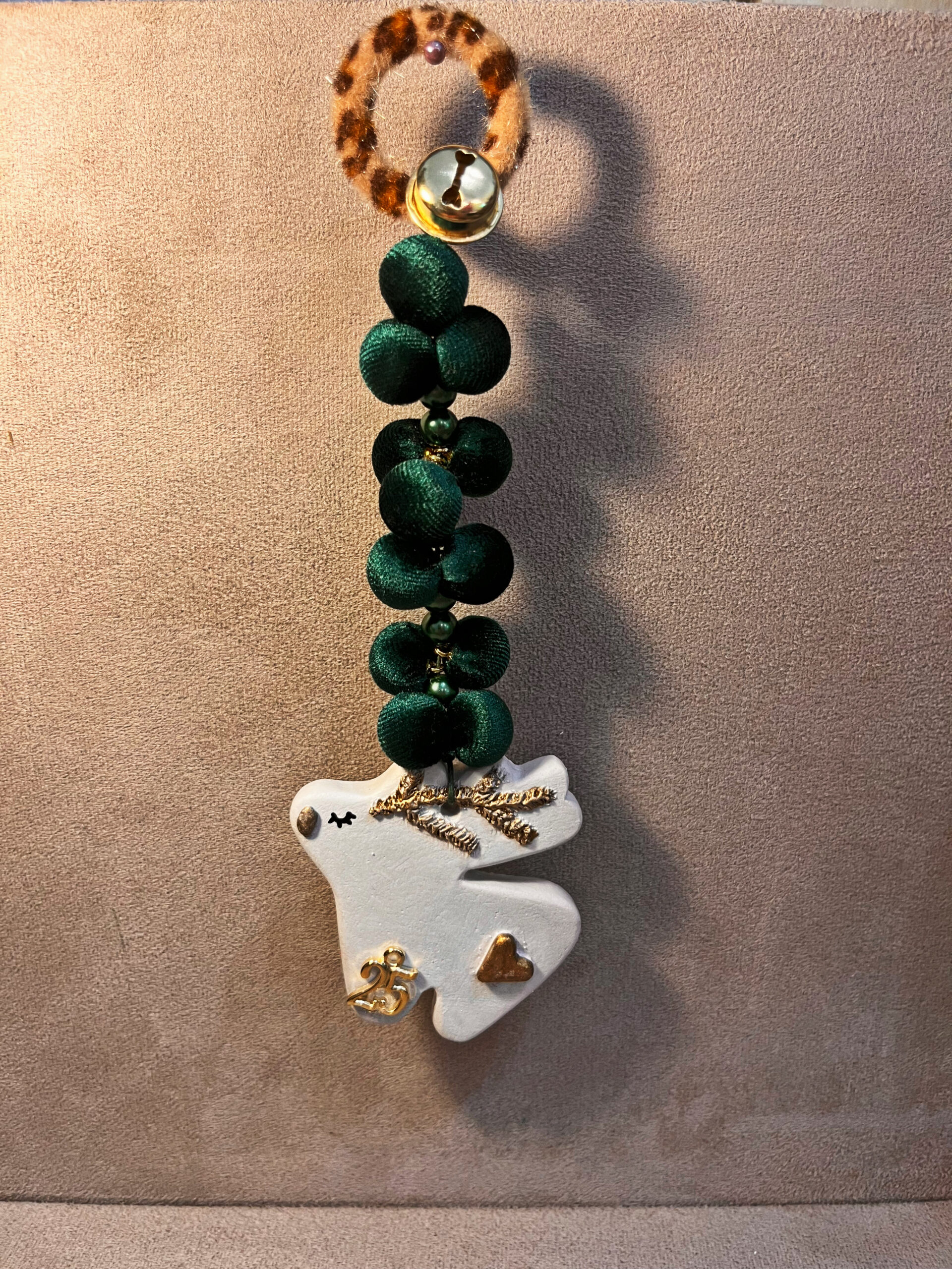 Γούρι με γύψινο ταρανδάκι,βελούδινα μικρά πομ πομ,κουδουνάκι και λεοπάρ λεπτομέρεια από γούνα