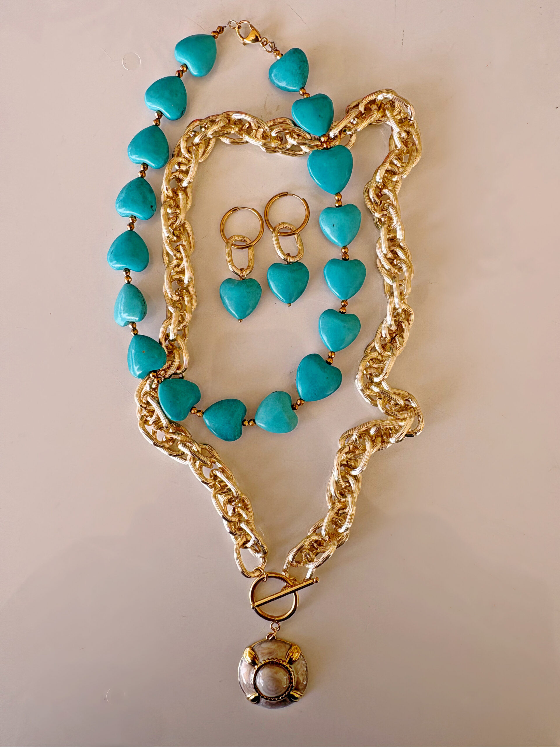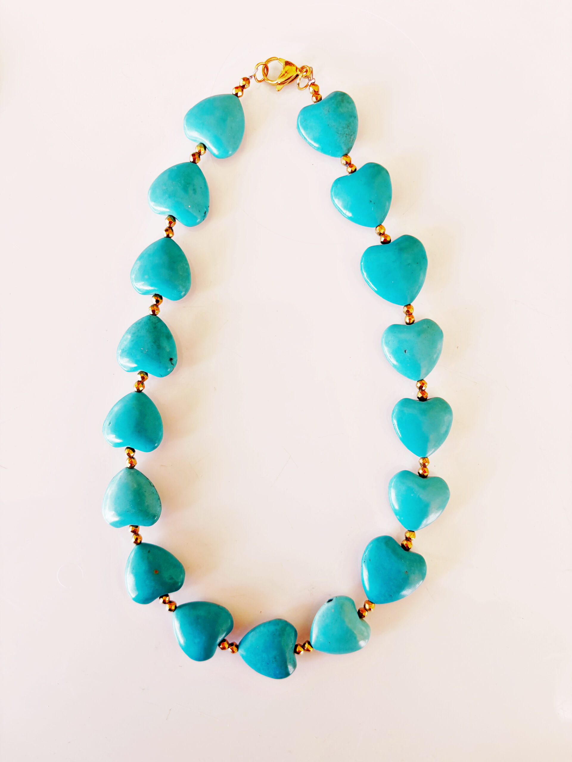 Κοντό κολιέ με τυρκουάζ καρδιές από χαολίτη και χρυσούς αιματίτες.