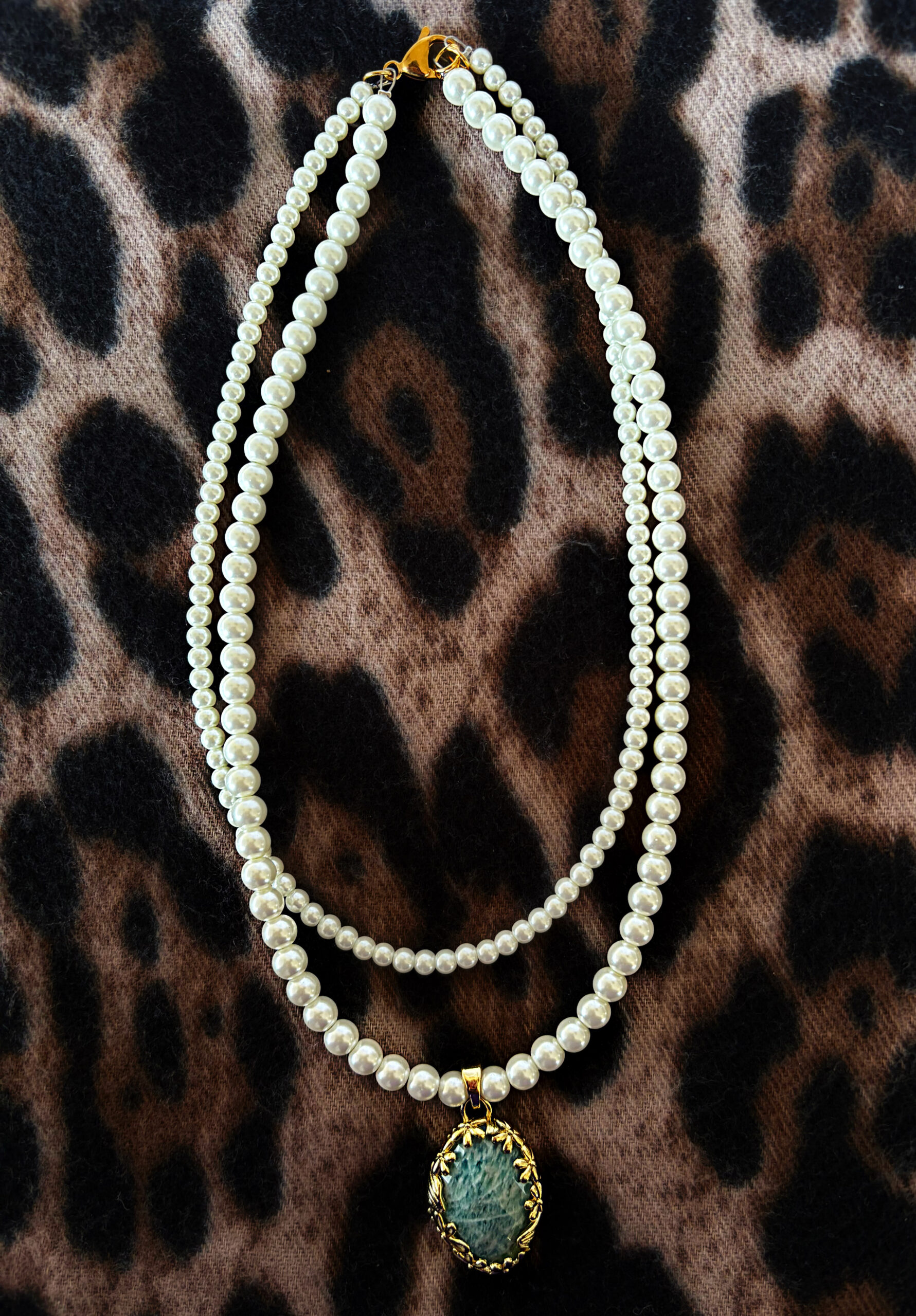 Διπλό κολιέ με πέρλες και μενταγιόν με ημιπολύτιμη πέτρα αμαζωνίτη.