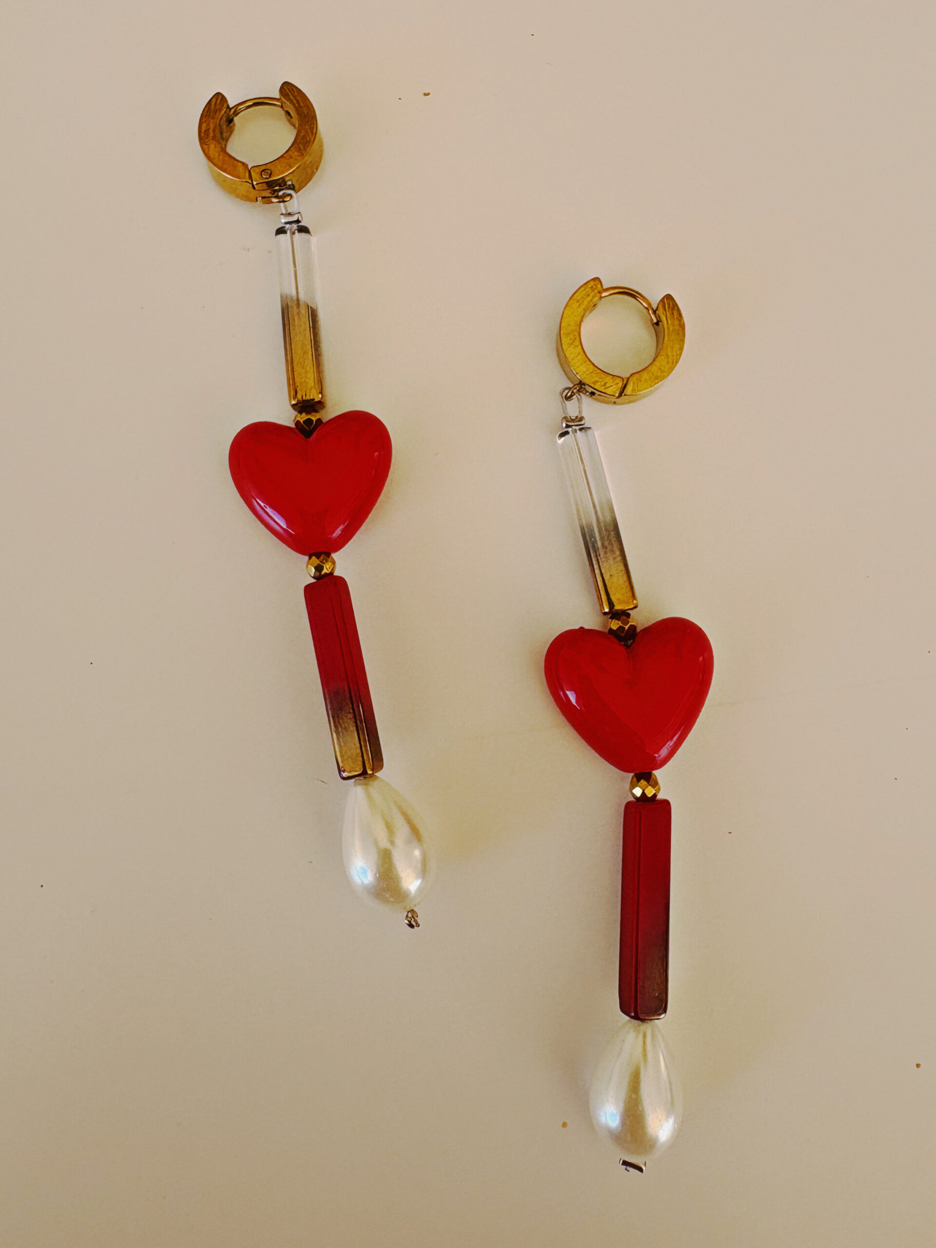 Ατσάλινα κρικάκια με κρεμαστά ντεγκραντέ κρύσταλλα,κόκκινες καρδιές και πέρλες.