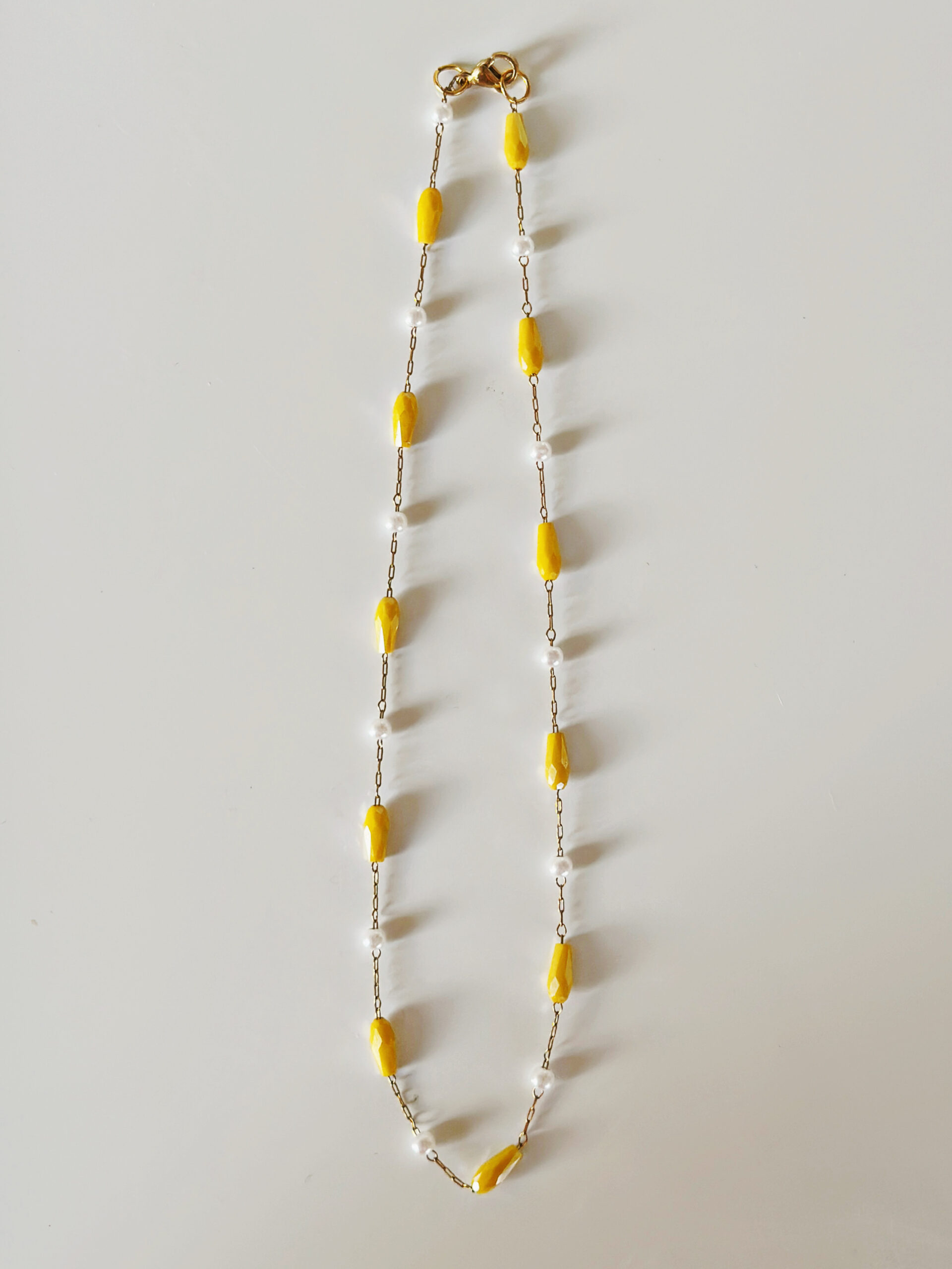 Λεπτό,ατσάλινο κολιέ,με κίτρινα κρυσταλλάκια και πέρλες.