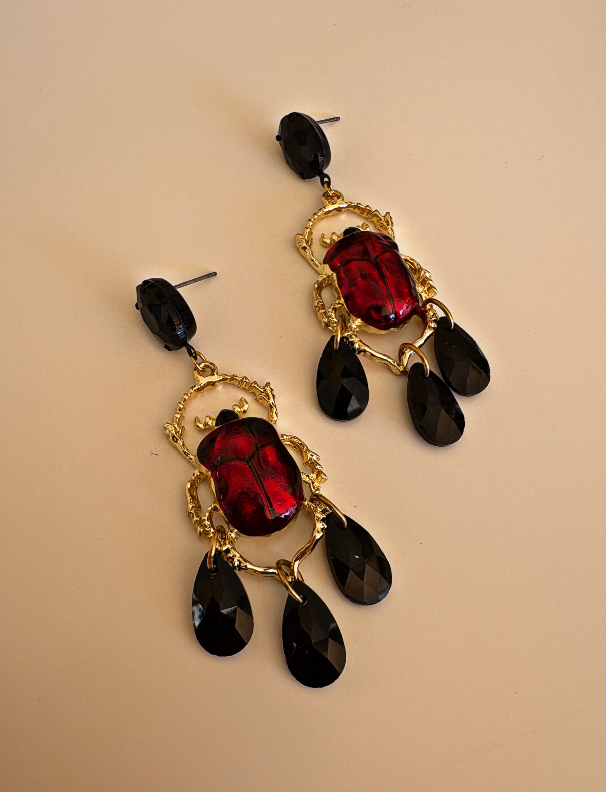 Μακριά, εντυπωσιακά σκουλαρίκια με μπορντώ σκαραβαίους και μαύρα κρύσταλλα.