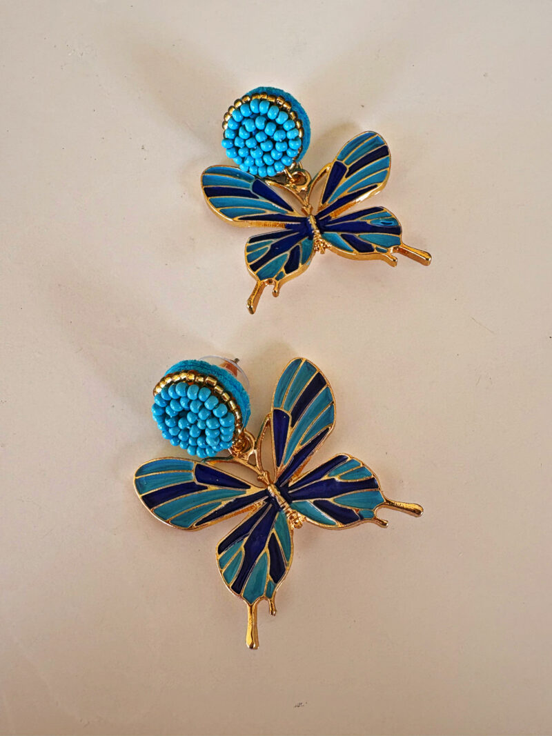 Σκουλαρίκια με μπλε πεταλούδες και χαντρένια μπλε κουμπώματα.