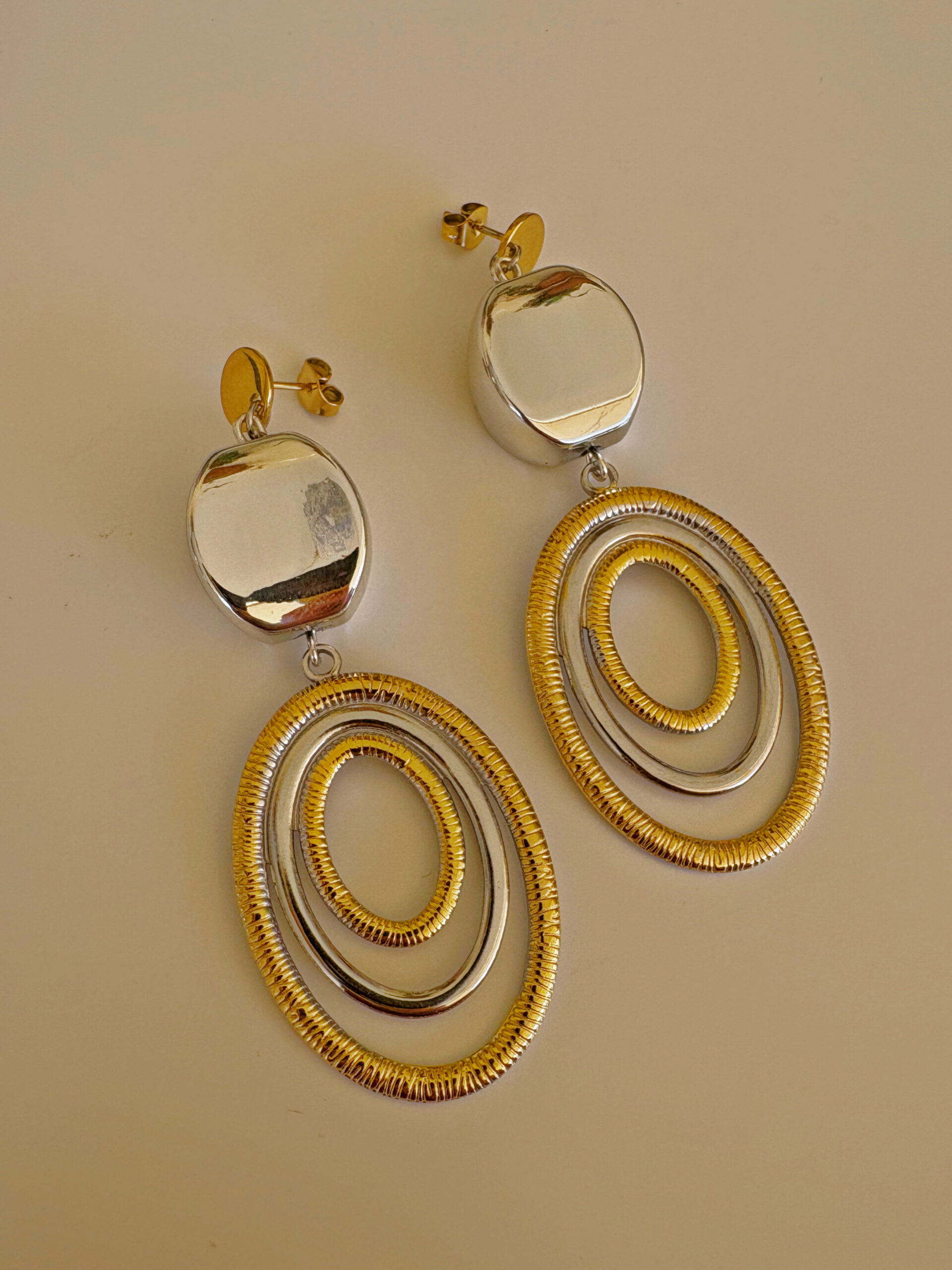 Μακριά, ατσάλινα σκουλαρίκια με συνδυασμό χρυσό-ασημί και οβάλ κρίκους στο κάτω μέρος.