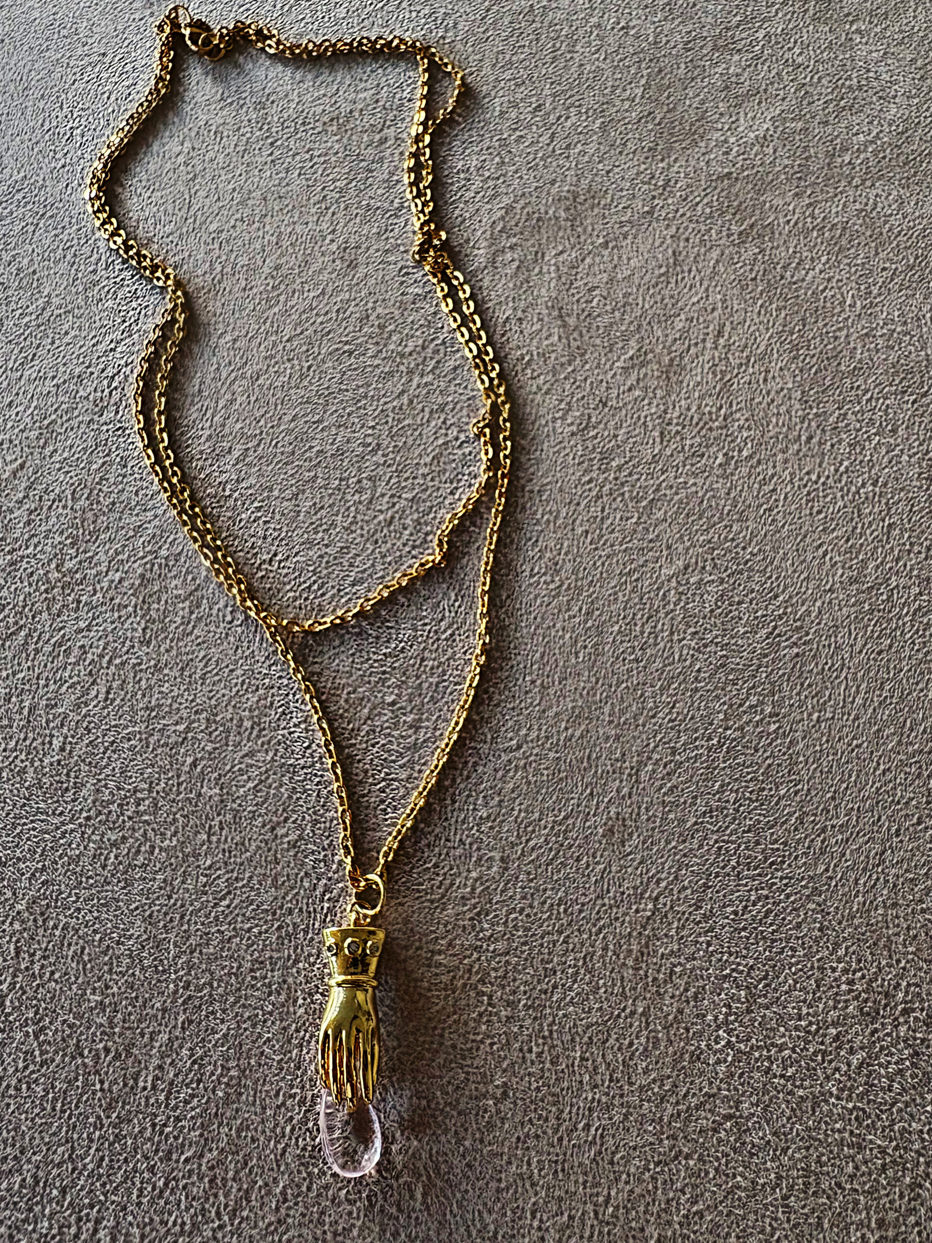 Κοντό κολιέ με διπλή, ατσάλινη αλυσίδα και μενταγιόν γάντι με γυάλινη σταγόνα.