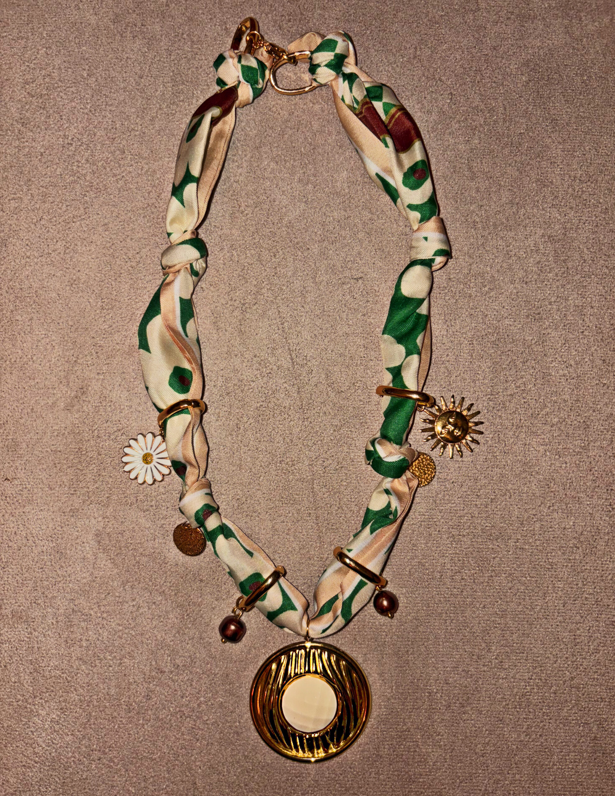 Κοντό κολιέ με φλοράλ μαντήλι,διάφορα κρεμαστά στοιχεία και μεγάλο στρογγυλό μενταγιόν.