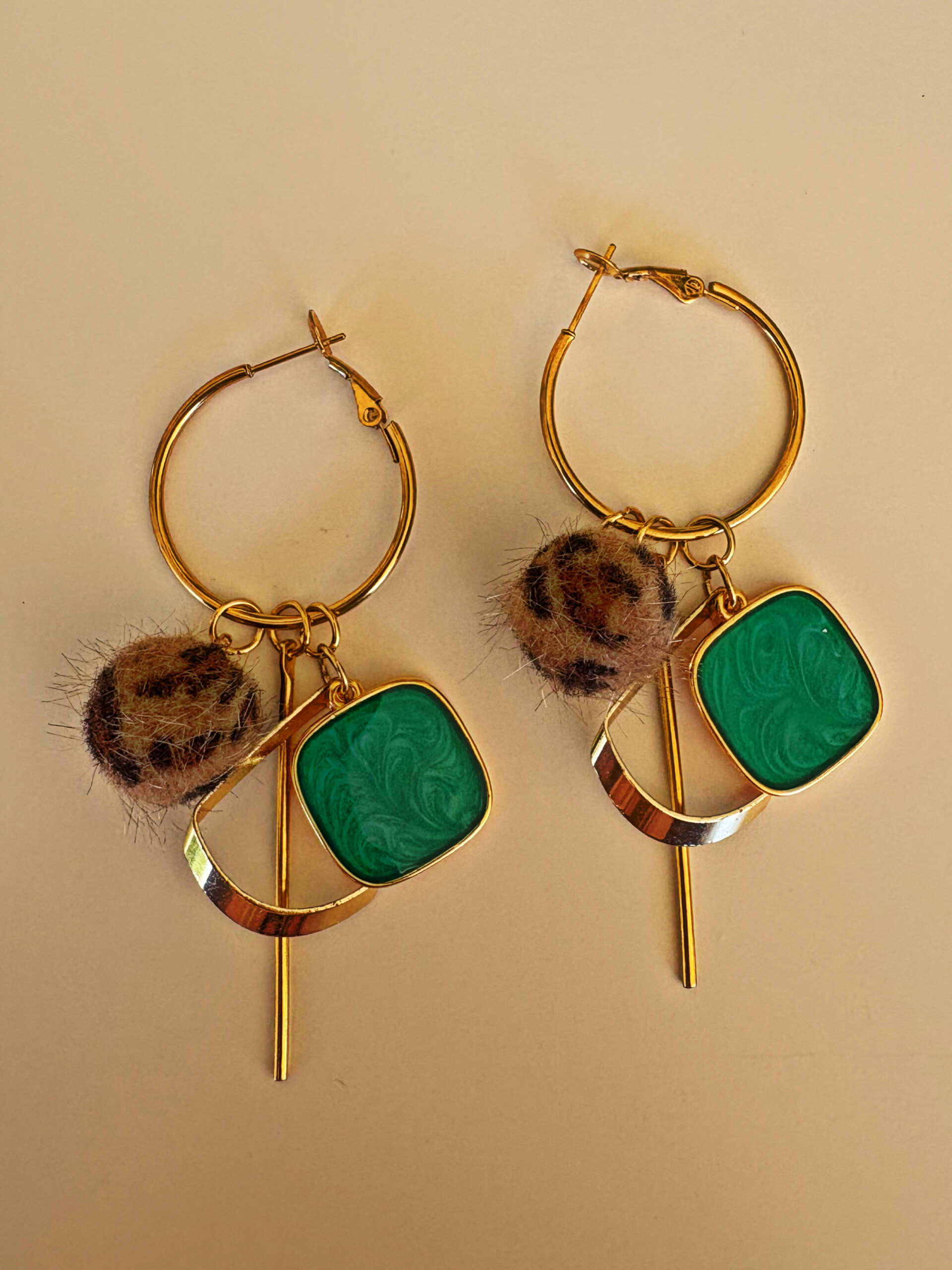 Ατσάλινοι μεγάλοι κρίκοι με κρεμαστά μοτιφ και γούνινες μπαλίτσες λεοπαρ.