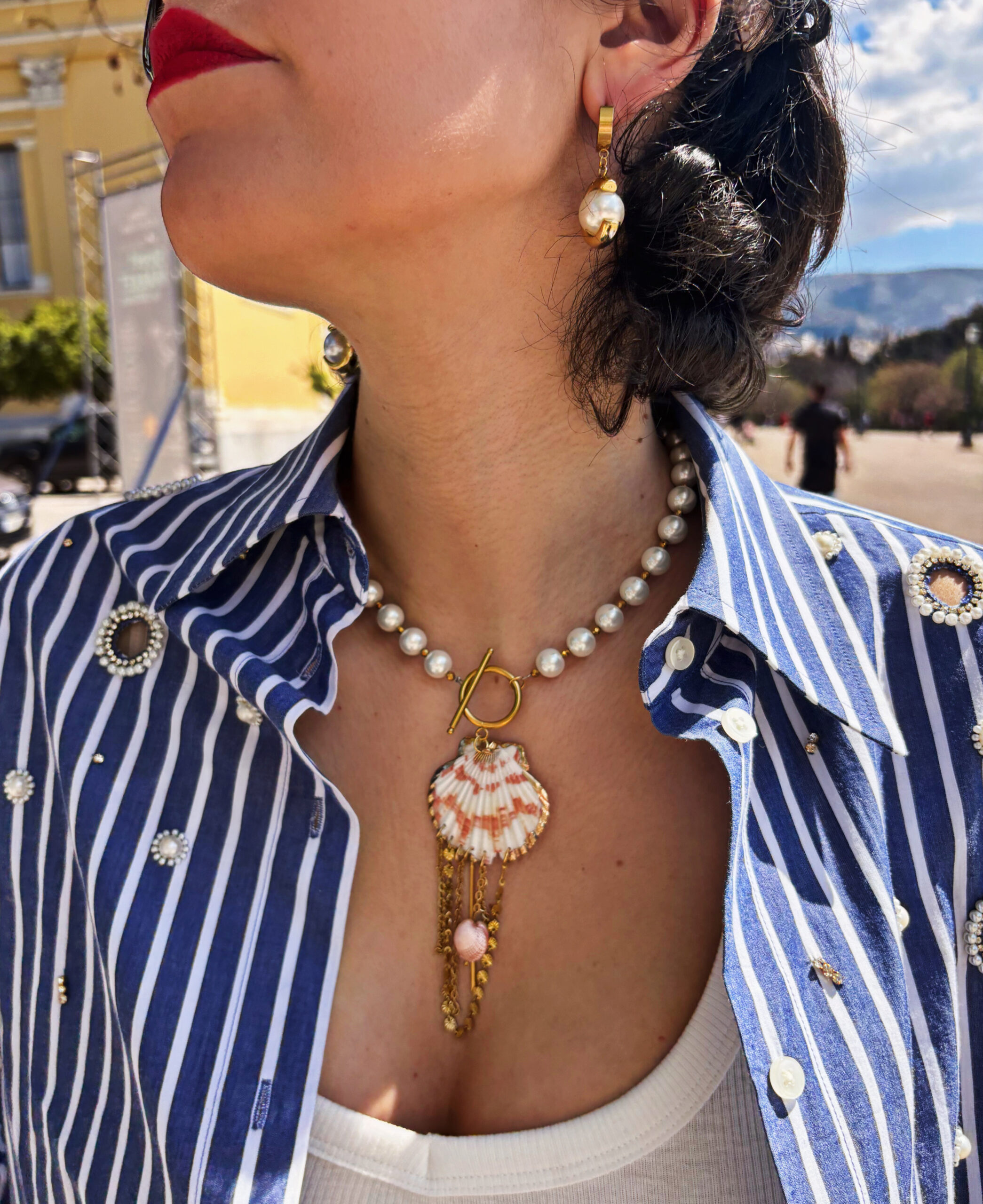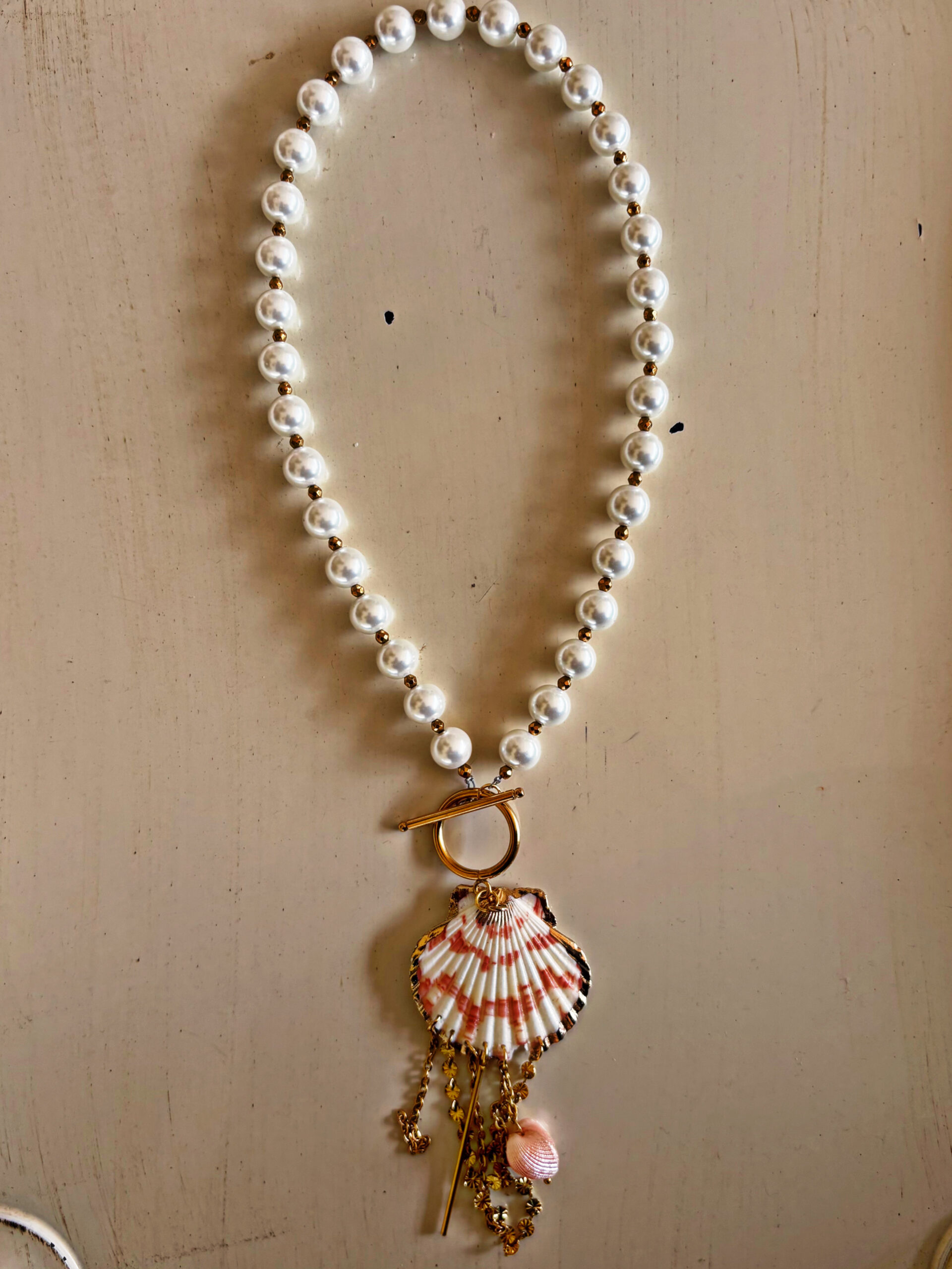 Εντυπωσιακό κολιέ με πέρλες,αιματίτες και μεγάλο φυσικό κοχύλι με ατσάλινες αλυσίδες.