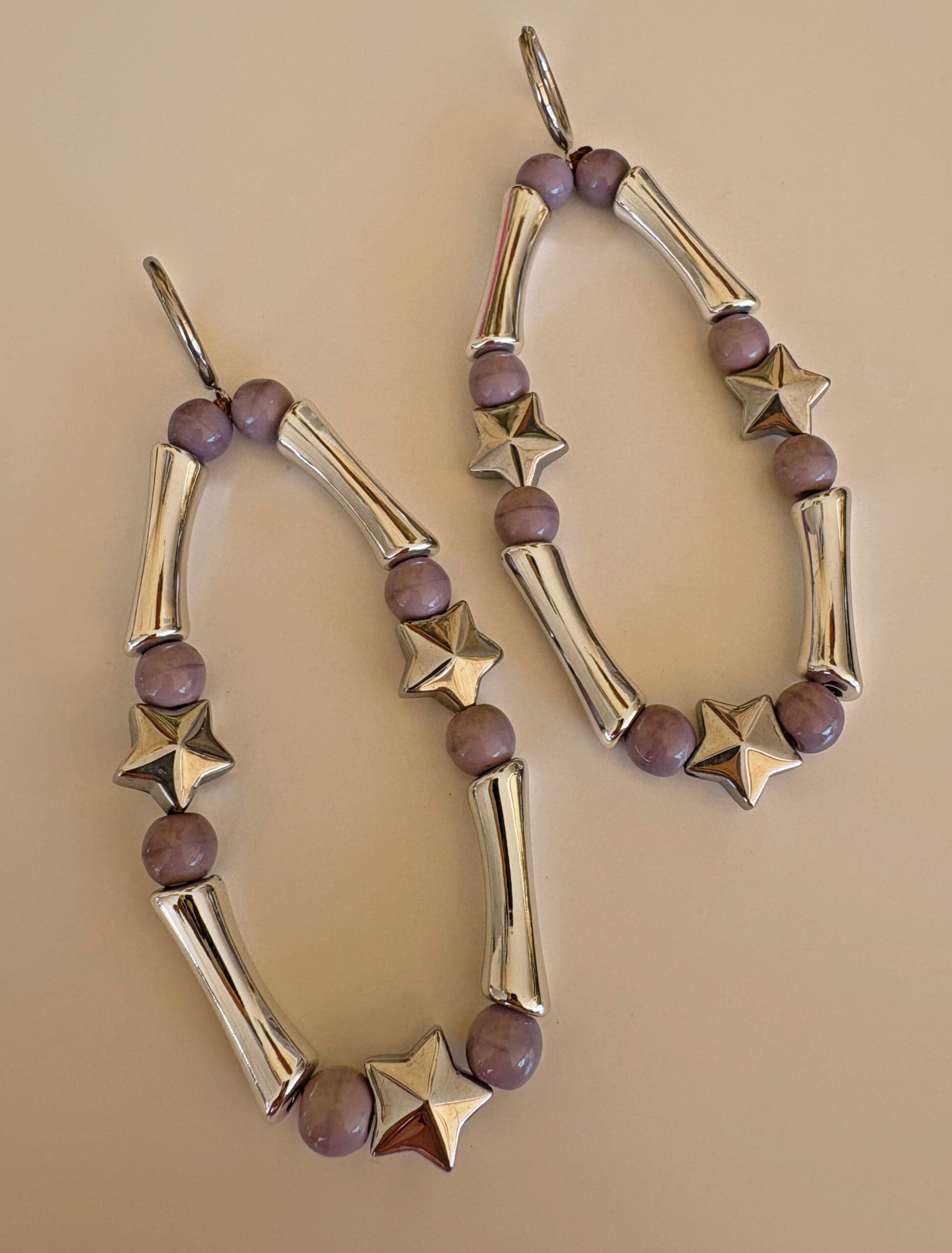 Μεγάλα, εντυπωσιακά σκουλαρίκια με ασημί και μωβ χάντρες και κρυστάλλινα αστέρια.