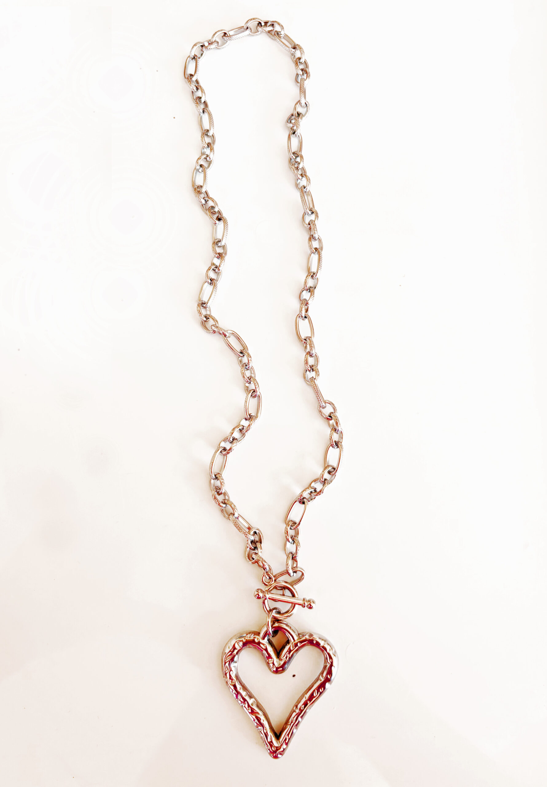 Κοντό ατσάλινο κολιέ σε ασημί χρώμα με μεγάλη καρδιά και κούμπωμα στο μπροστινό μέρος.