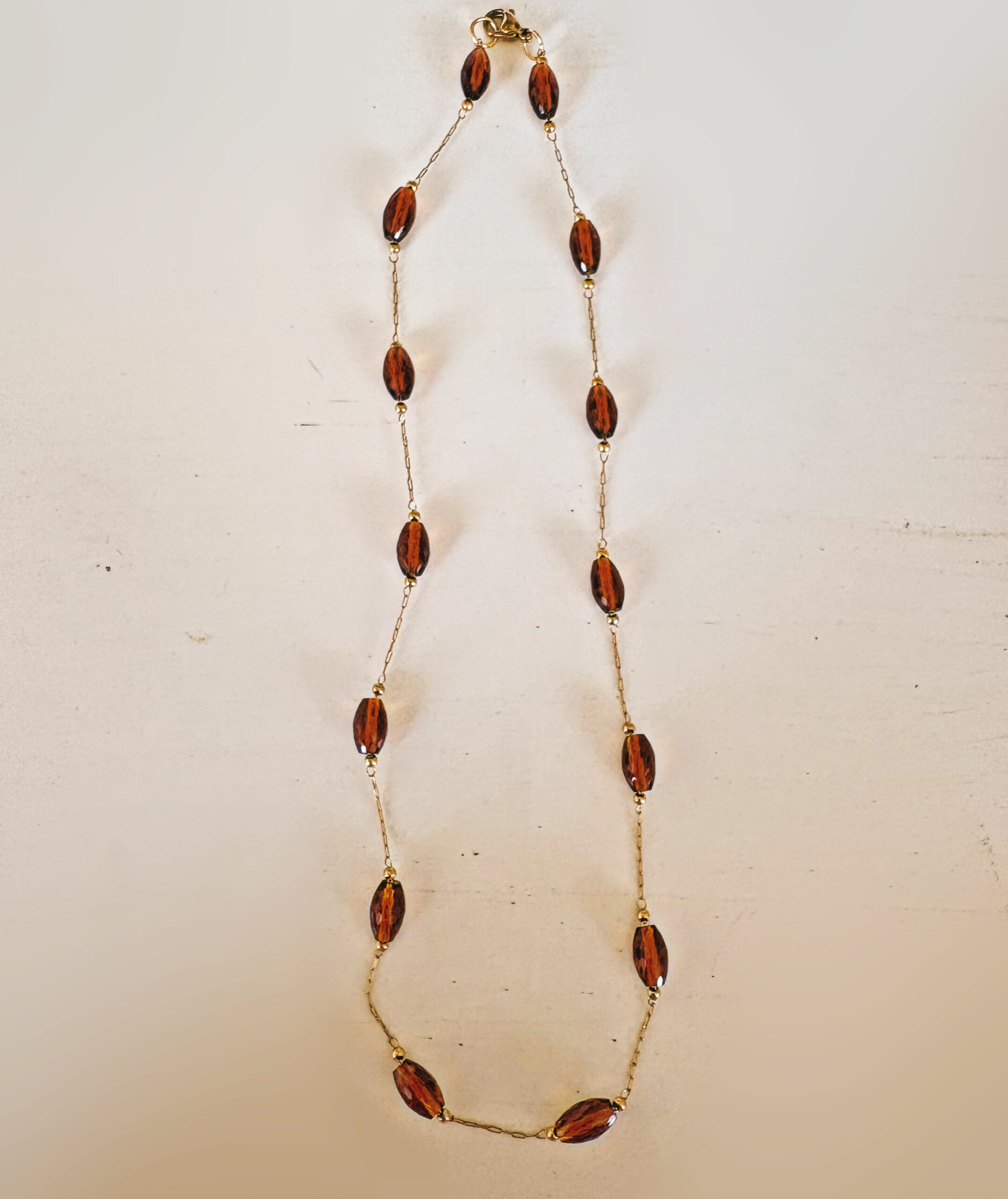 Κοντό, ατσάλινο κολιέ με καφέ κρυστάλλινες χάντρες.