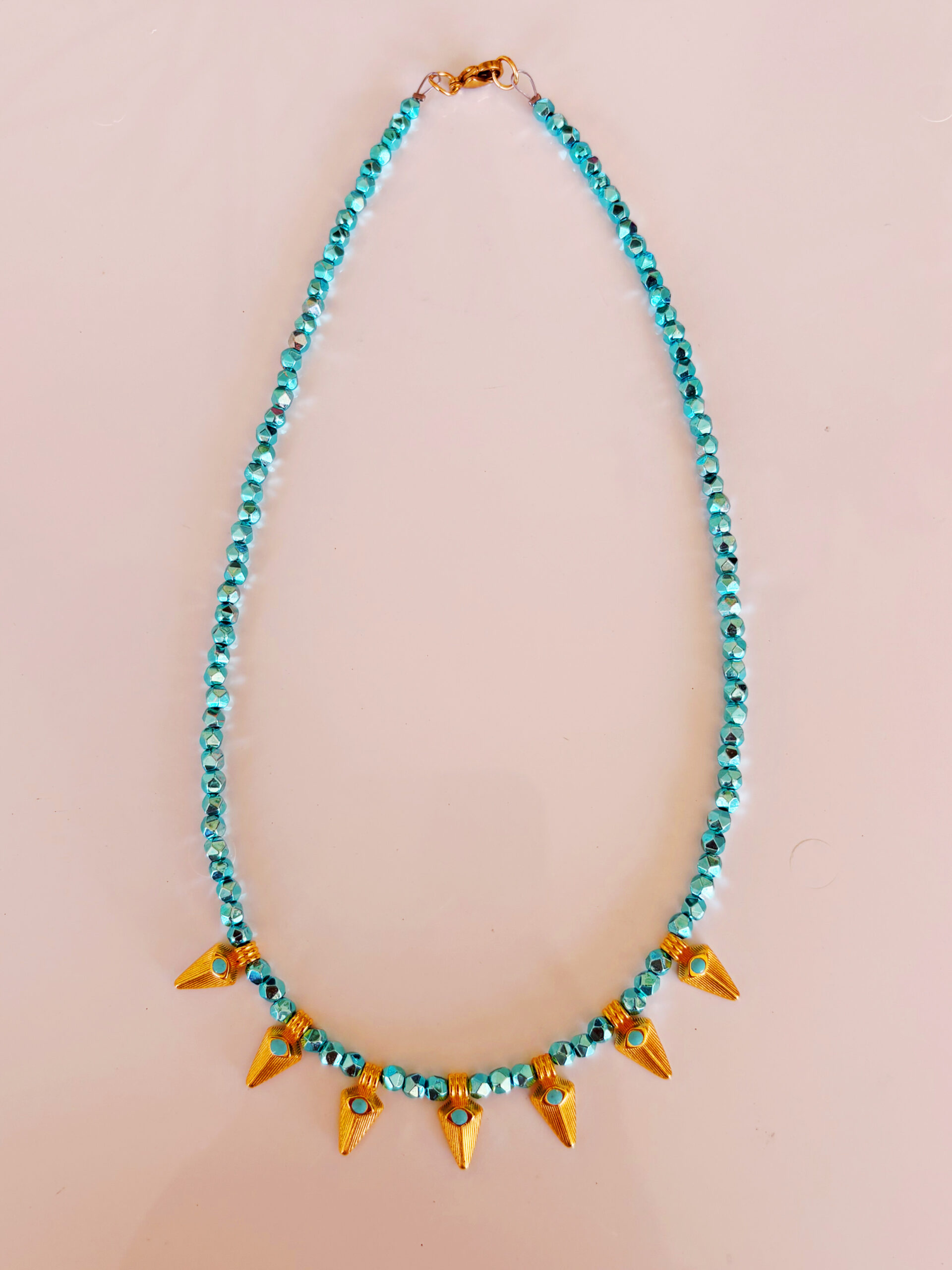 Κοντό κολιέ με μπλε γυαλιστερούς αιματίτες και μικρά επιχρυσωμένα στοιχεία με μπλε σμάλτο.