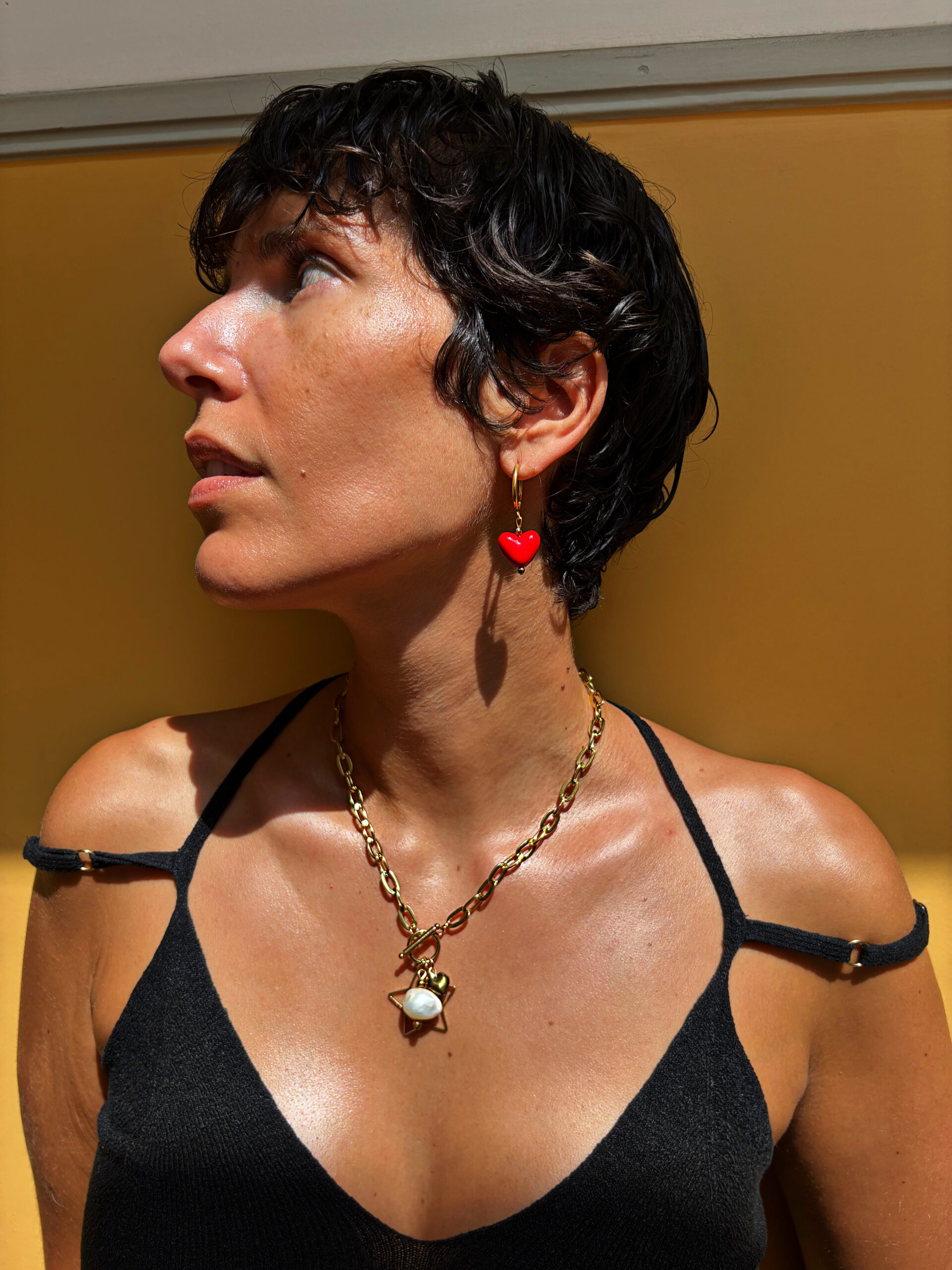 Κοντό, ατσάλινο κολιέ με διάφορα κρεμαστά μοτίφ και κούμπωμα στο μπροστινό μέρος.