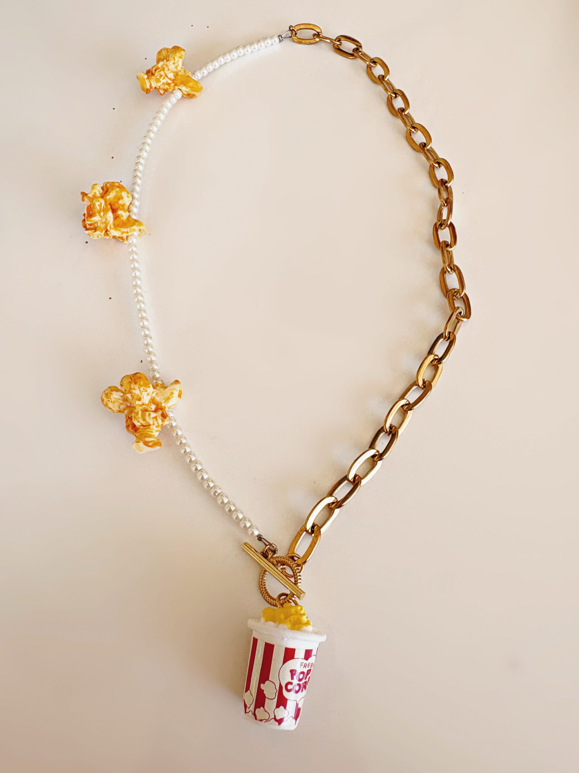 Κοντό κολιέ με συνδυασμό από πέρλες,ατσάλινη αλυσίδα και στοιχεία ποπκόρν.