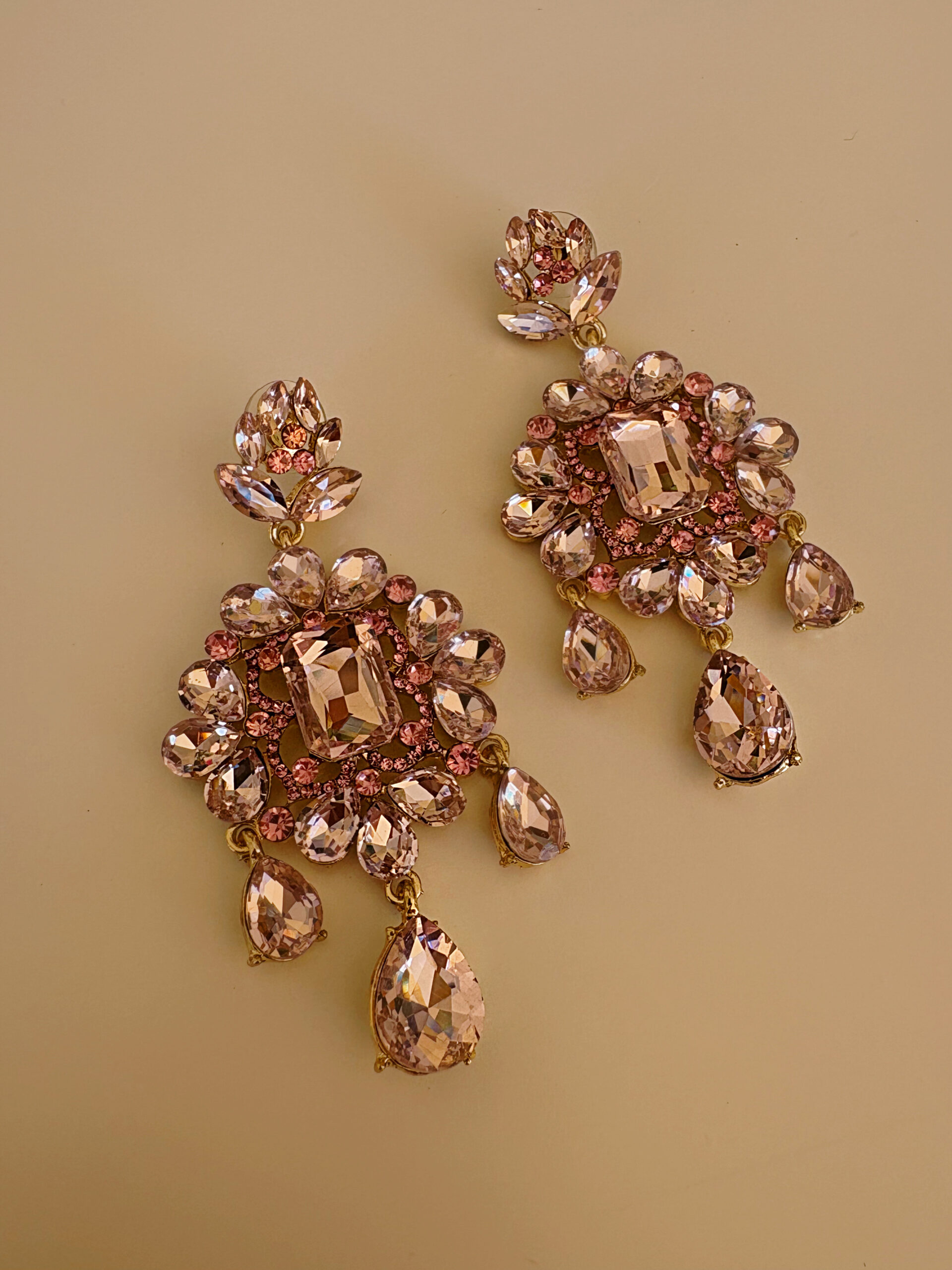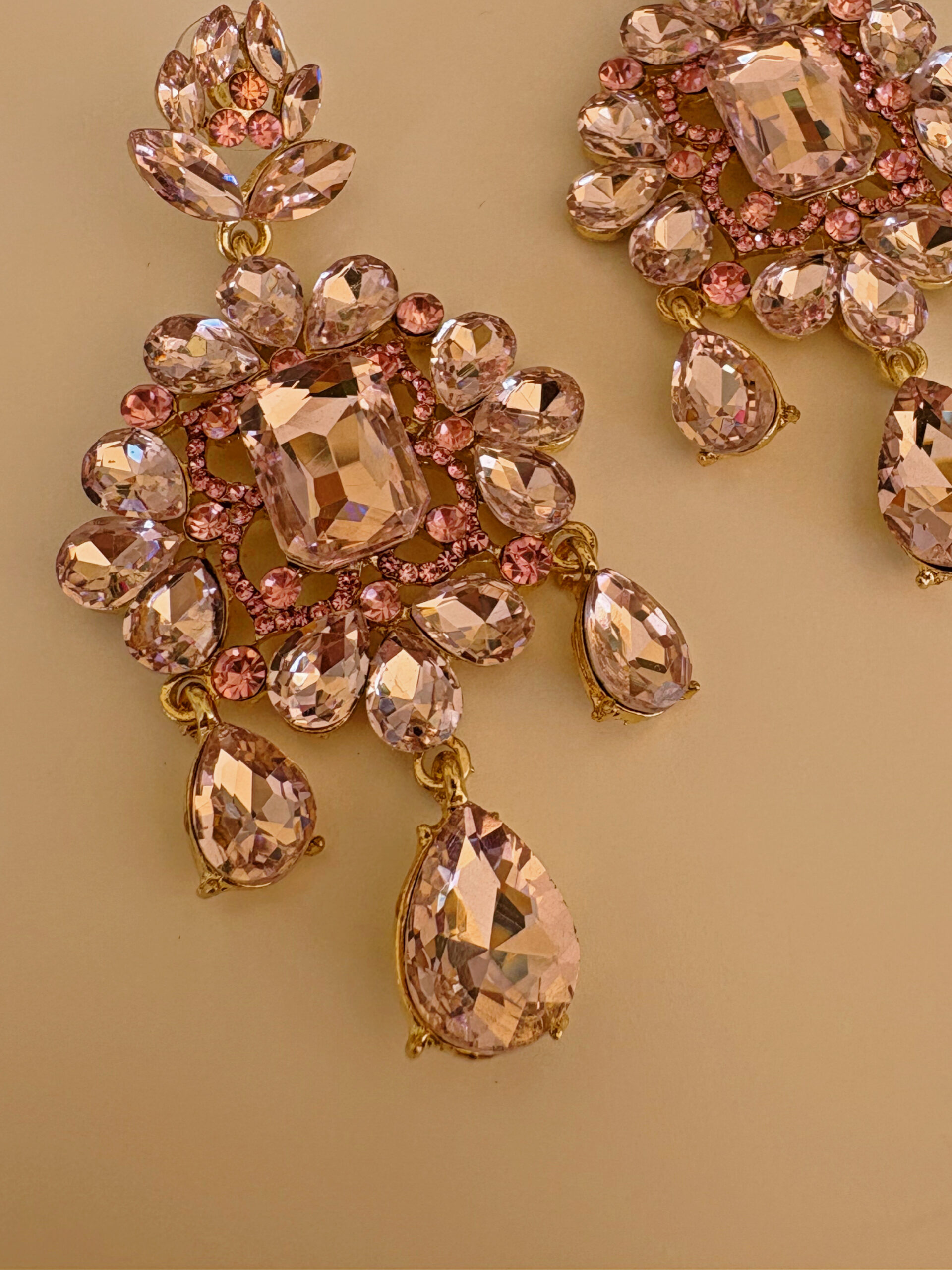 Μακριά, εντυπωσιακά σκουλαρίκια με ροζ στρας.