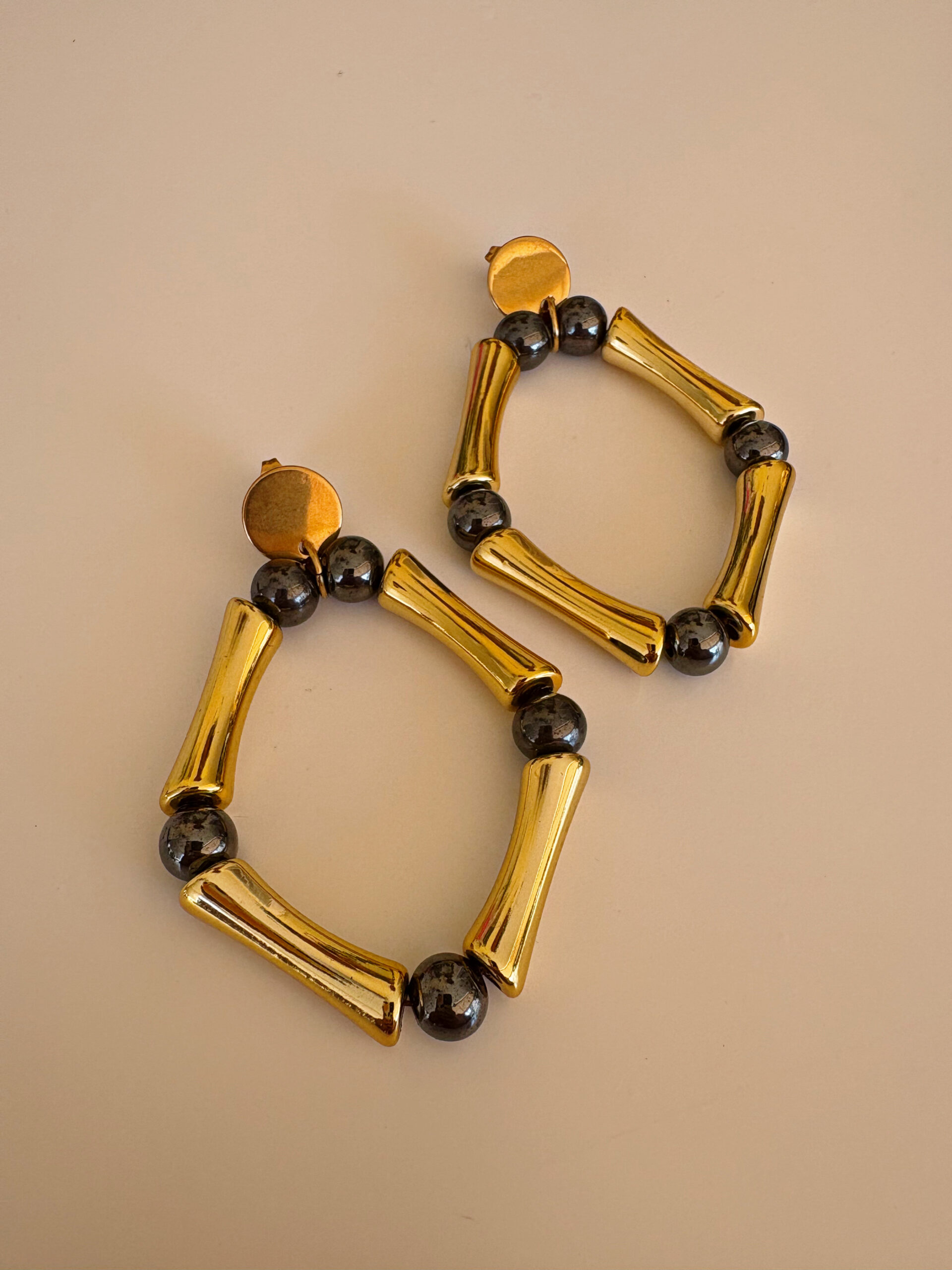 Μεσαιού μεγέθους σκουλαρίκια με χρυσές χάντρες-σωλήνες και στρογγυλούς αιματίτες.