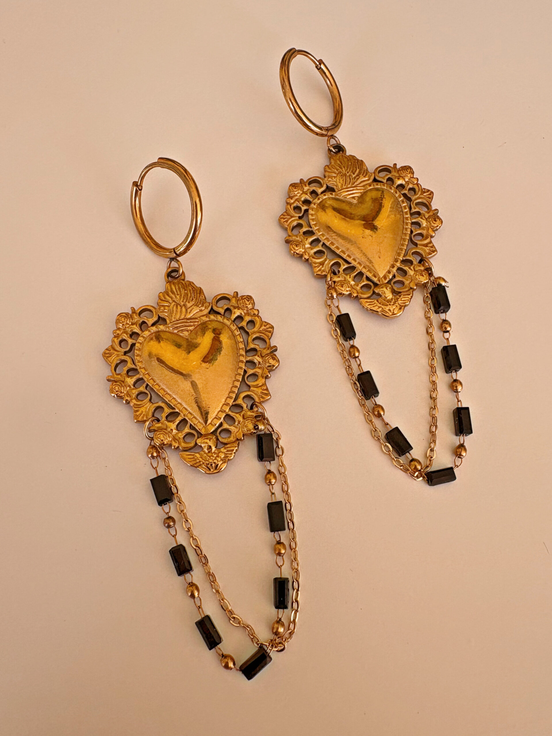 Μεγάλοι, ατσάλινοι κρίκοι με ατσάλινες καρδιές και αλυσίδα με μαύρα κρύσταλλα.