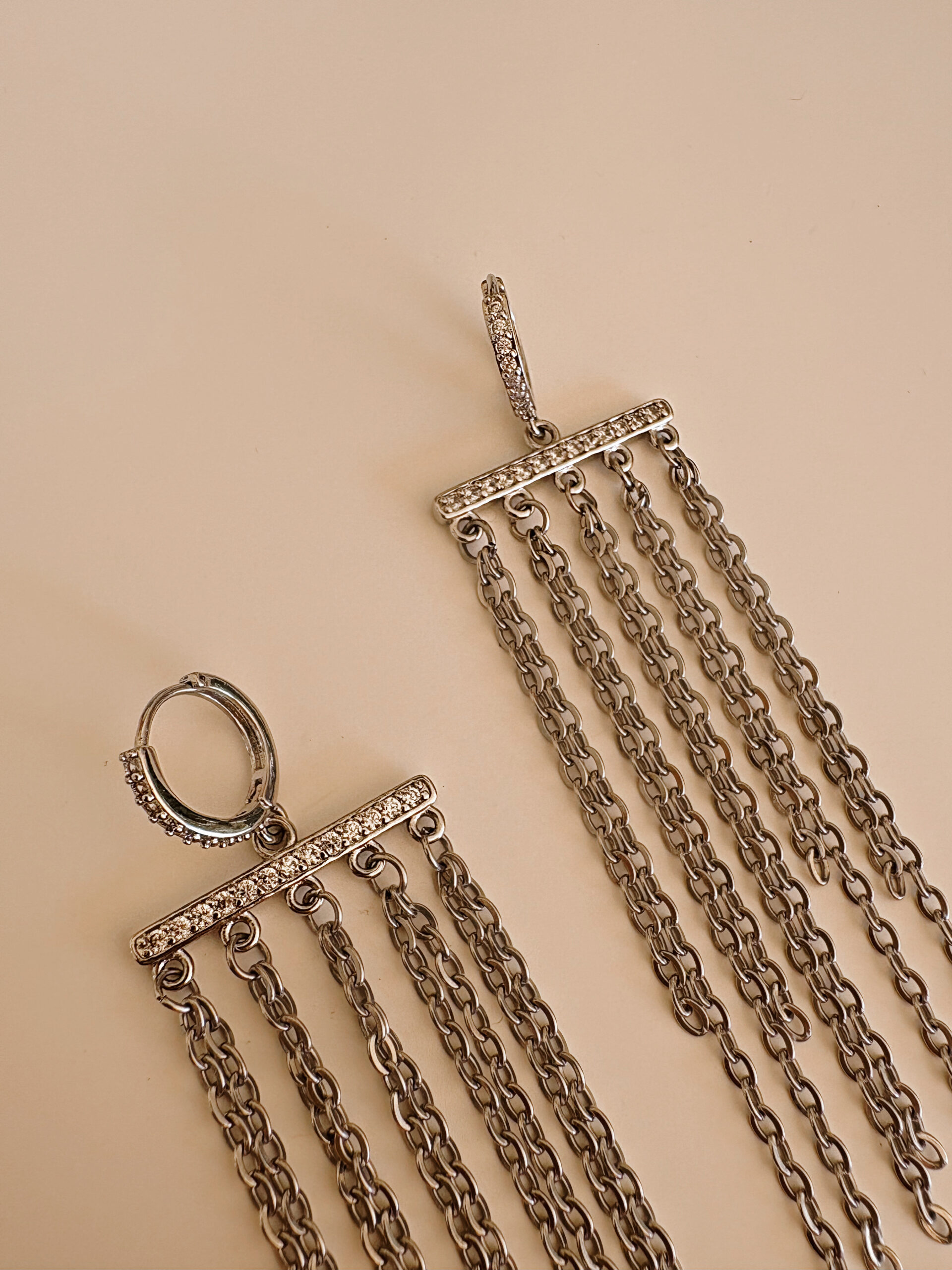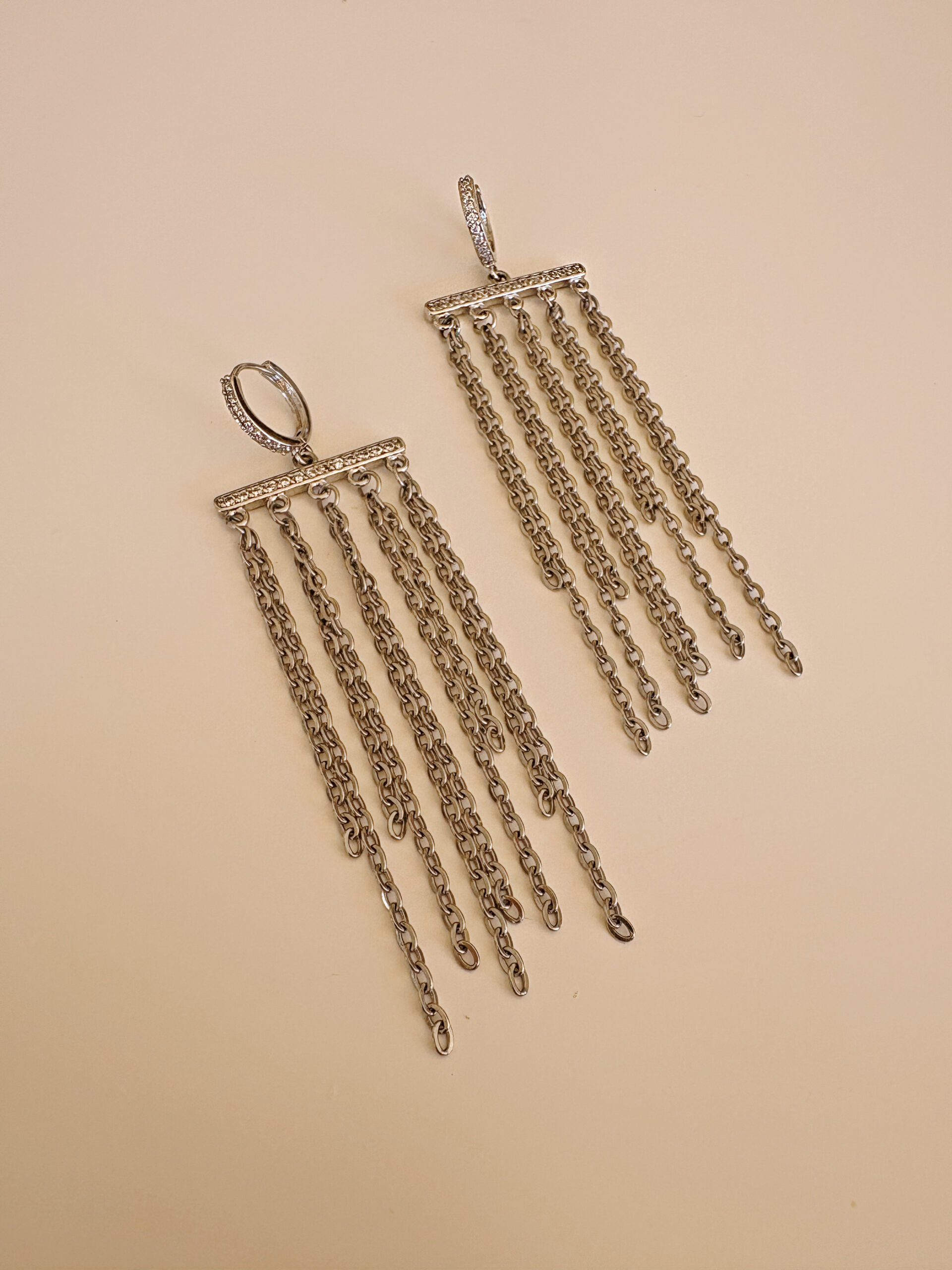 Μακριά σκουλαρίκια με πολλά ατσάλινα αλυσιδάκια και λευκά ζιργκόν στο πάνω μέρος και το κούμπωμα.
