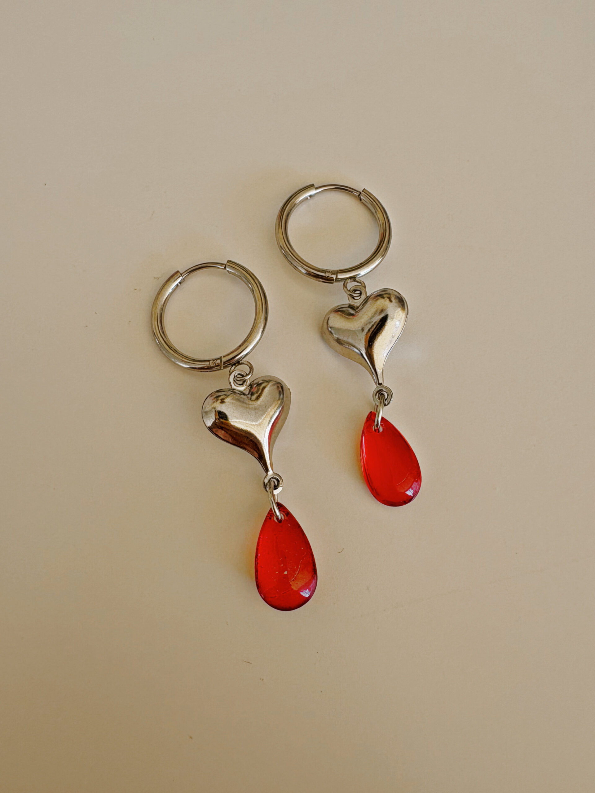 Μικρά, ατσάλινα κρικάκια με κρεμαστές κόκκινες, γυάλινες σταγόνες.