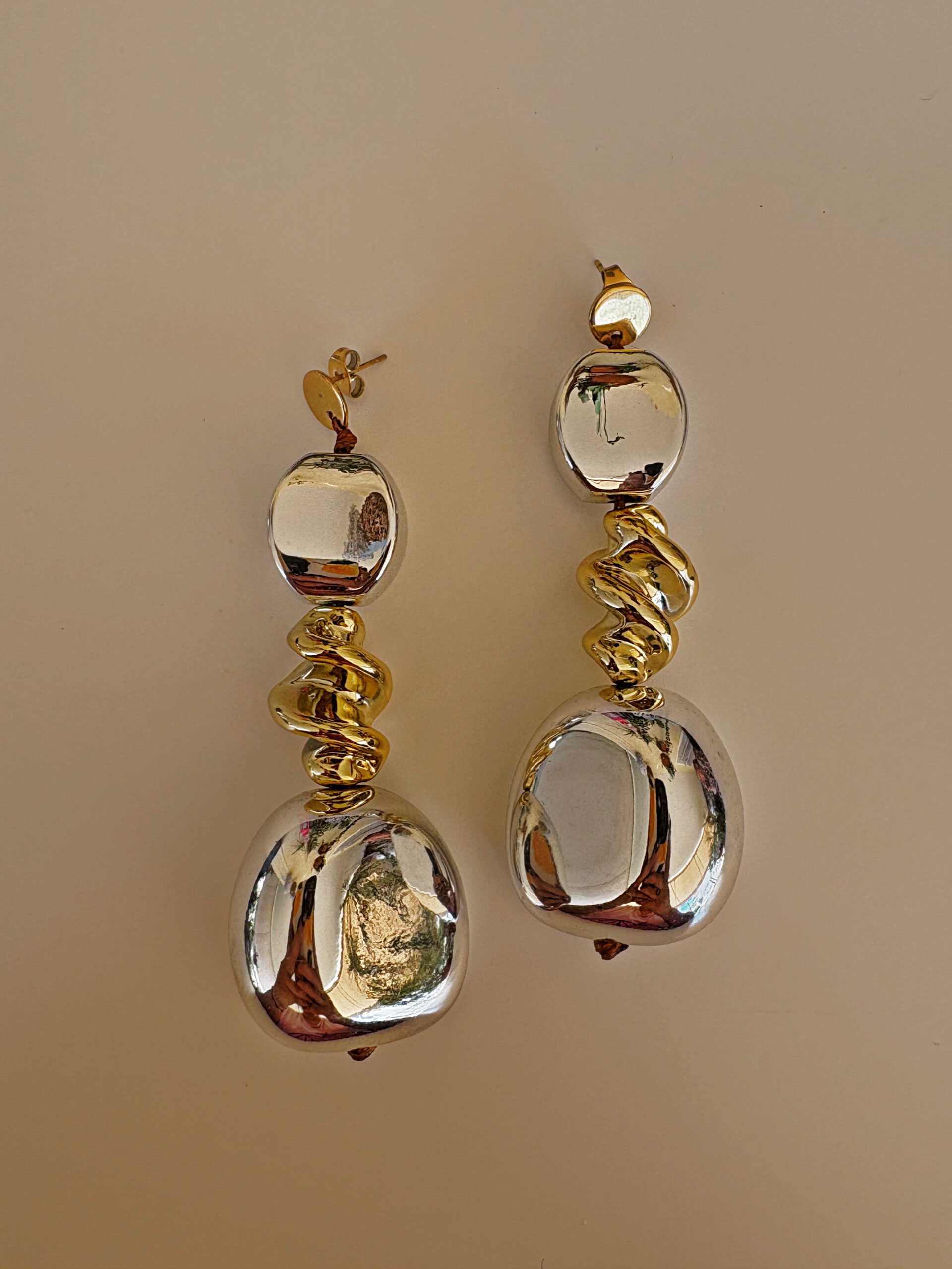 Μακριά σκουλαρίκια με ελαφριές χάντρες σε διάφορα σχήματα και συνδυασμό χρυσού-ασημί.