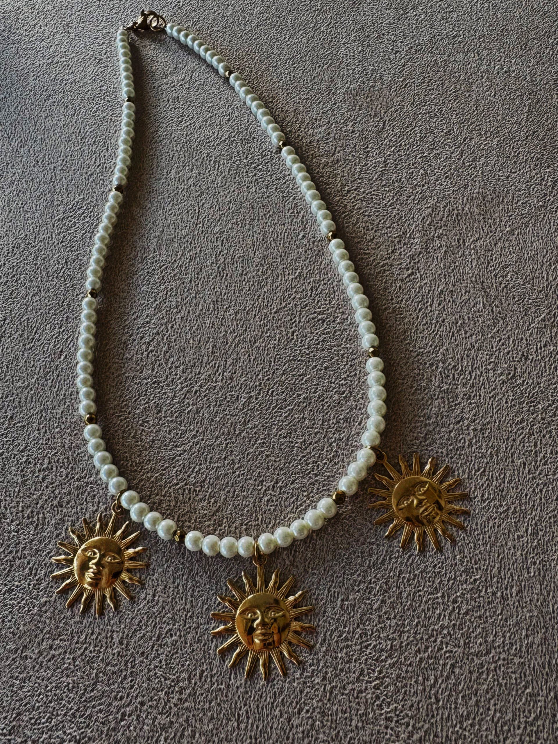 Κοντό κολιέ με περλίτσες,αιματίτες και ατσάλινους ήλιους.