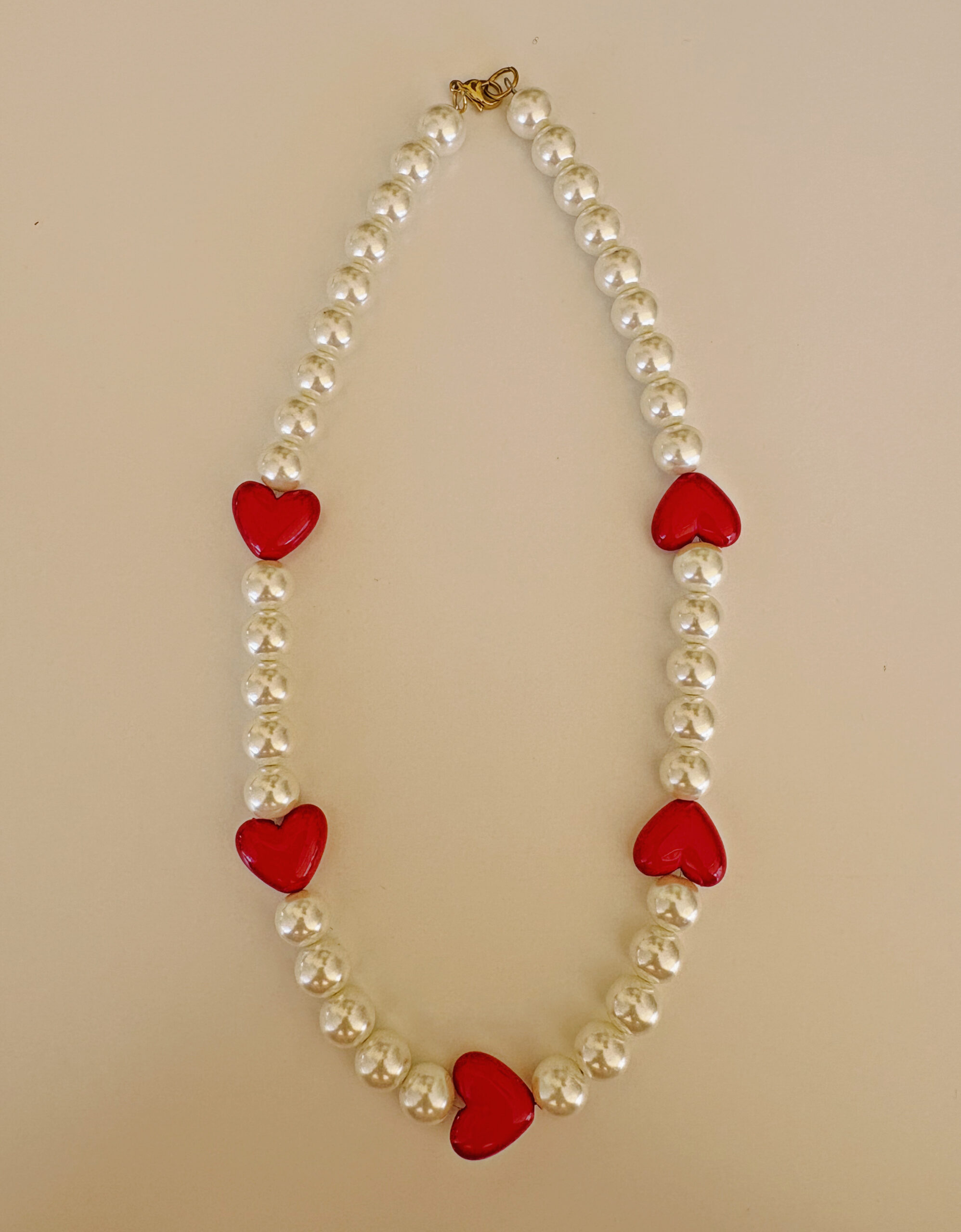 Κοντό κολιέ με λευκές πέρλες μεσαίου μεγέθους και κόκκινες καρδούλες.
