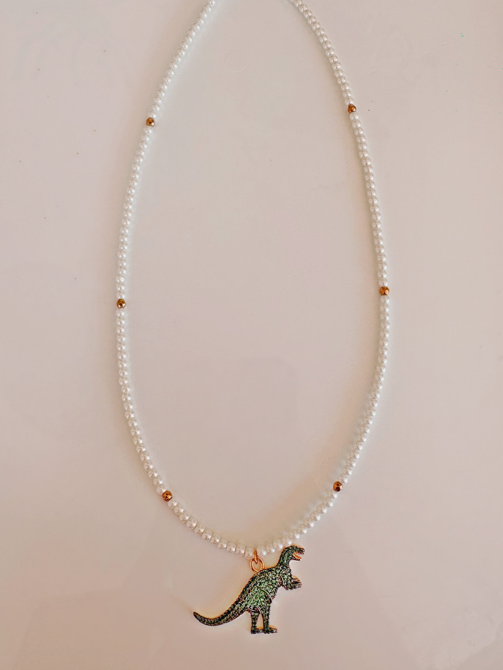 Κοντό κολιέ με πέρλες,αιματιτές και μενταγιόν-δεινόσαυρο με πράσινα στρας.