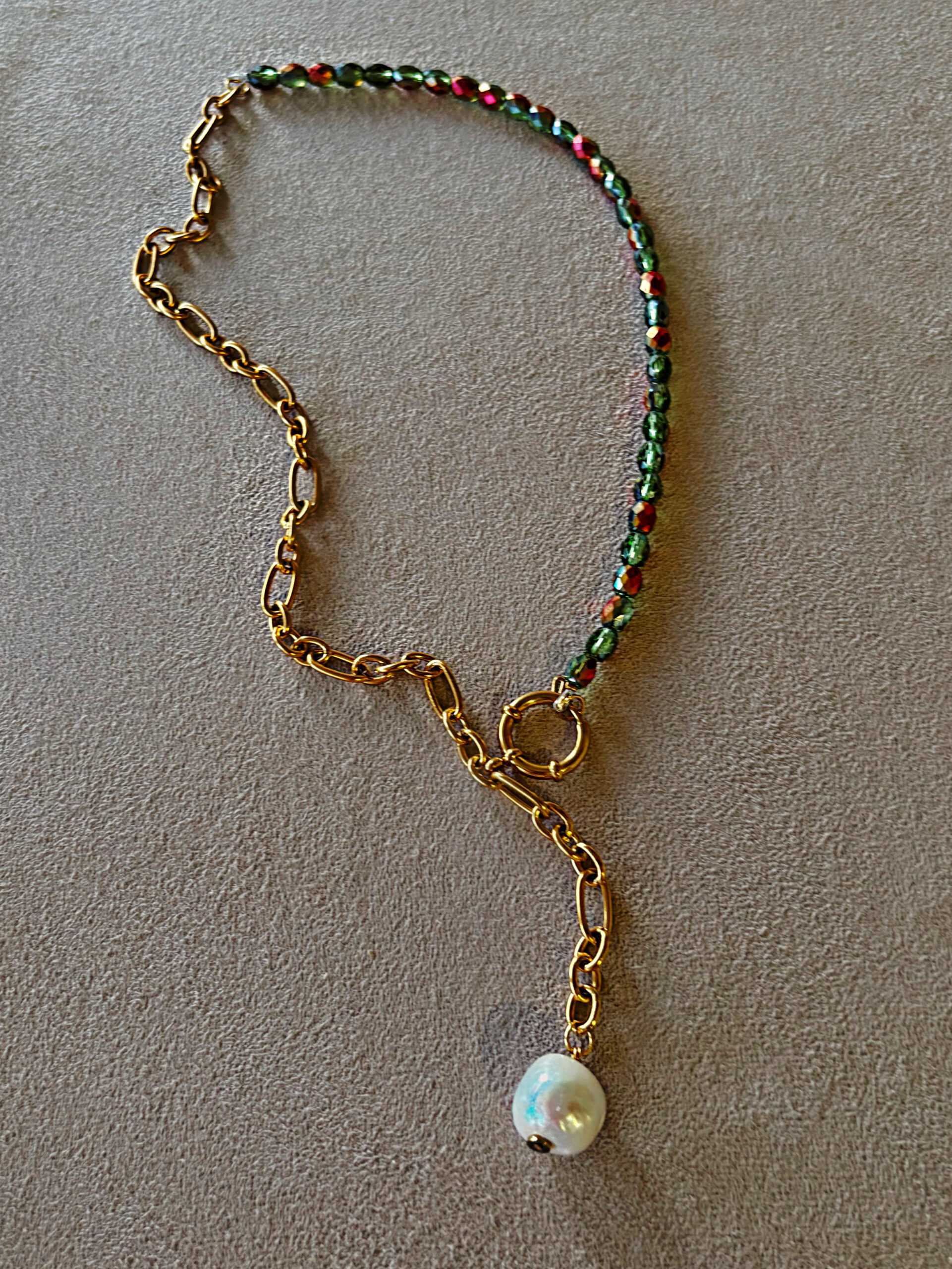 Κολιέ με συνδυασμό υλικών. Μισό κολιέ με ατσάλινη αλυσίδα, μισό με κρύσταλλα και στο τελείωμα μενταγιόν-μαργαριτάρι.