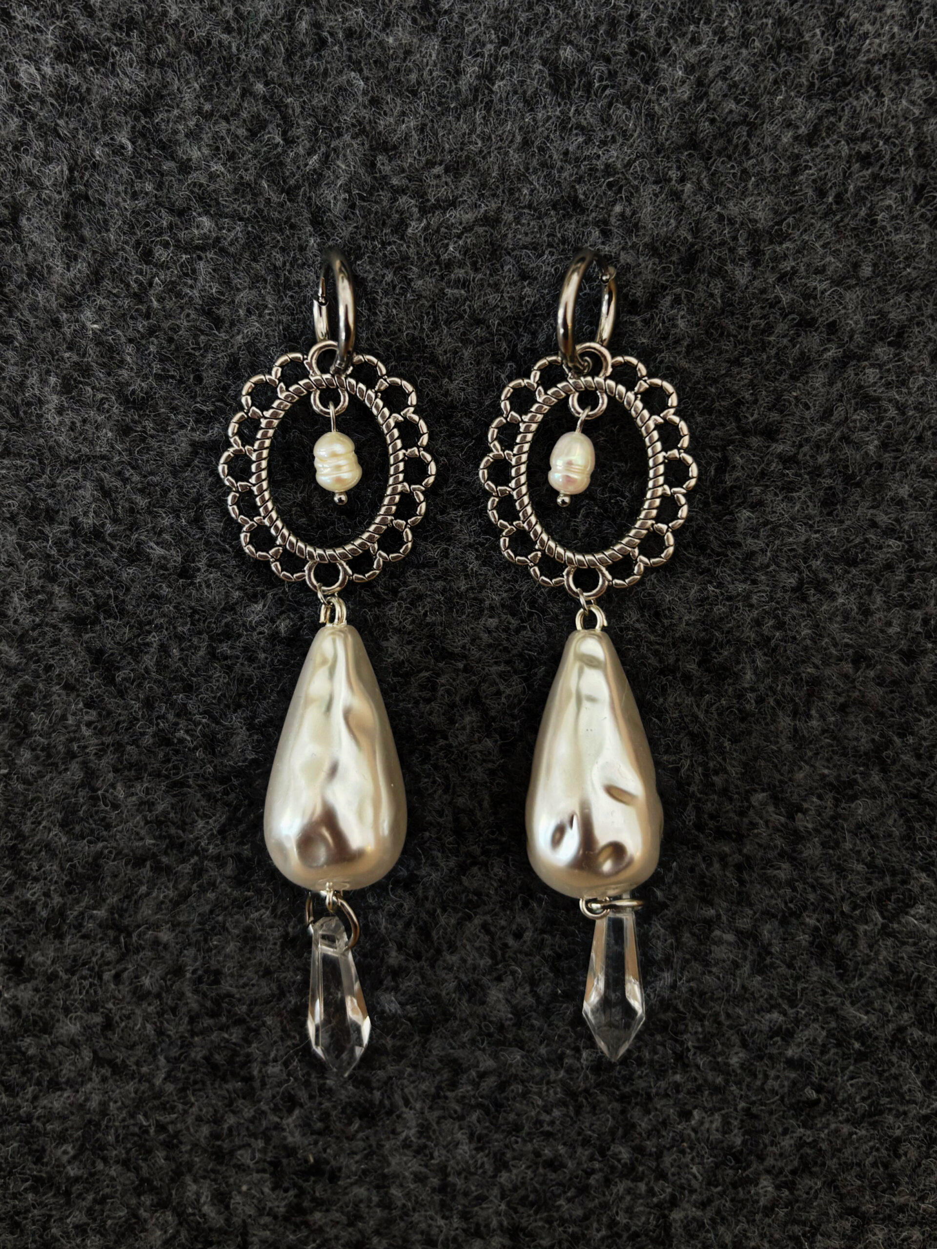 Μακριά ασημί σκουλαρίκια με μαργαριτάρια και πέρλες.