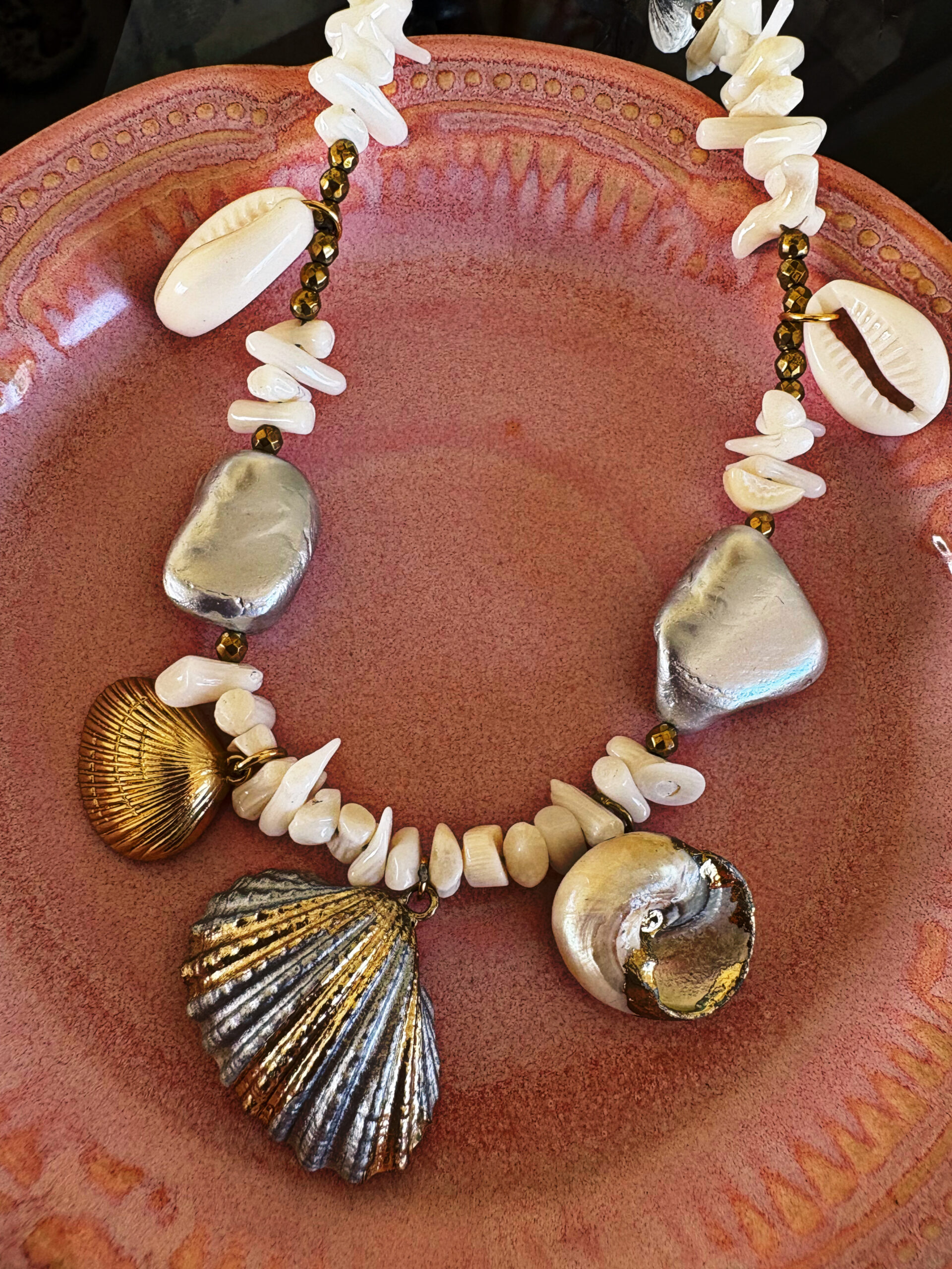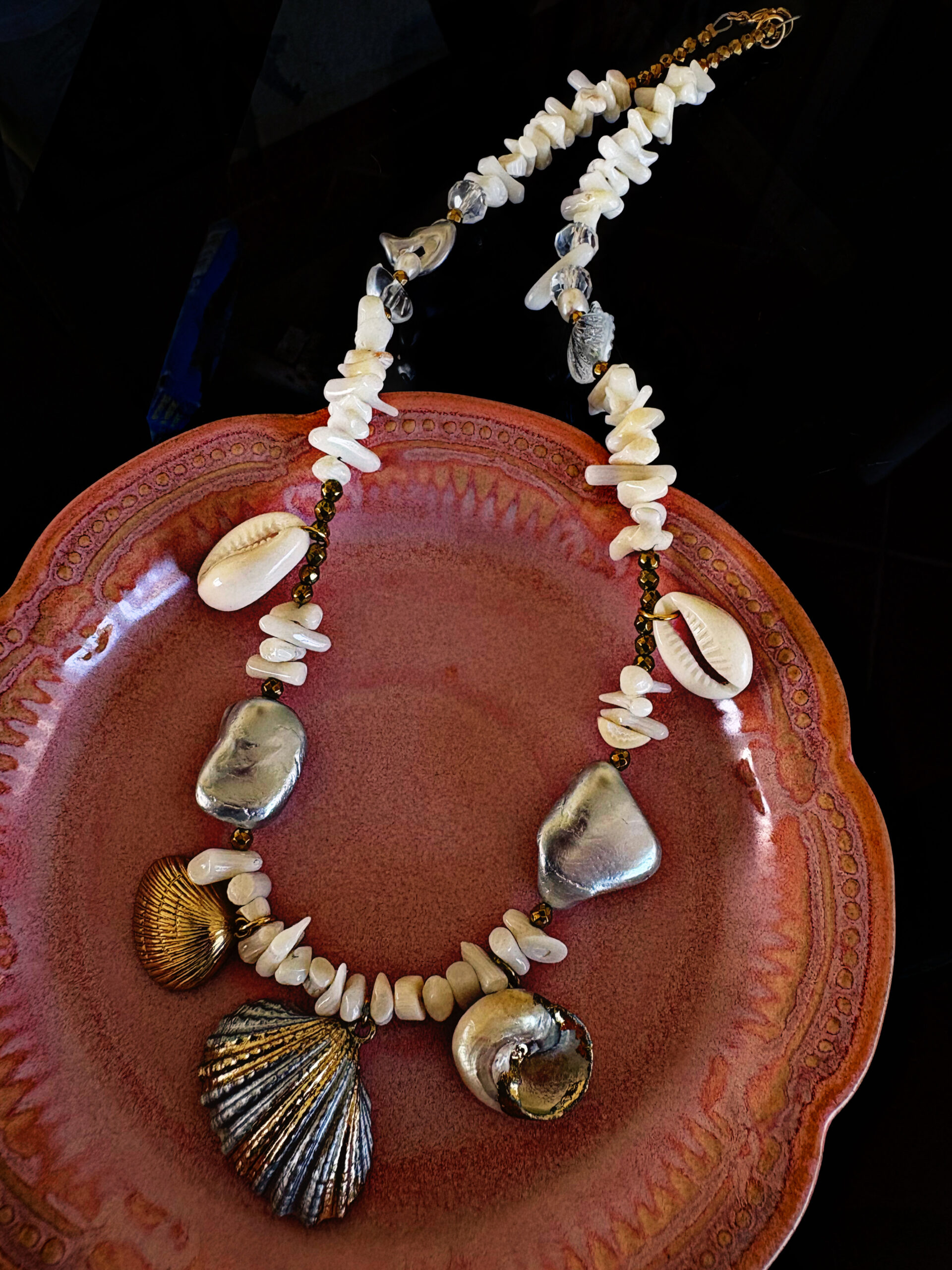 Κοντό κολιέ με συνδυασμό υλικών. Μαργαριτάρια,κοράλια,κοχύλια και αιματίτες.