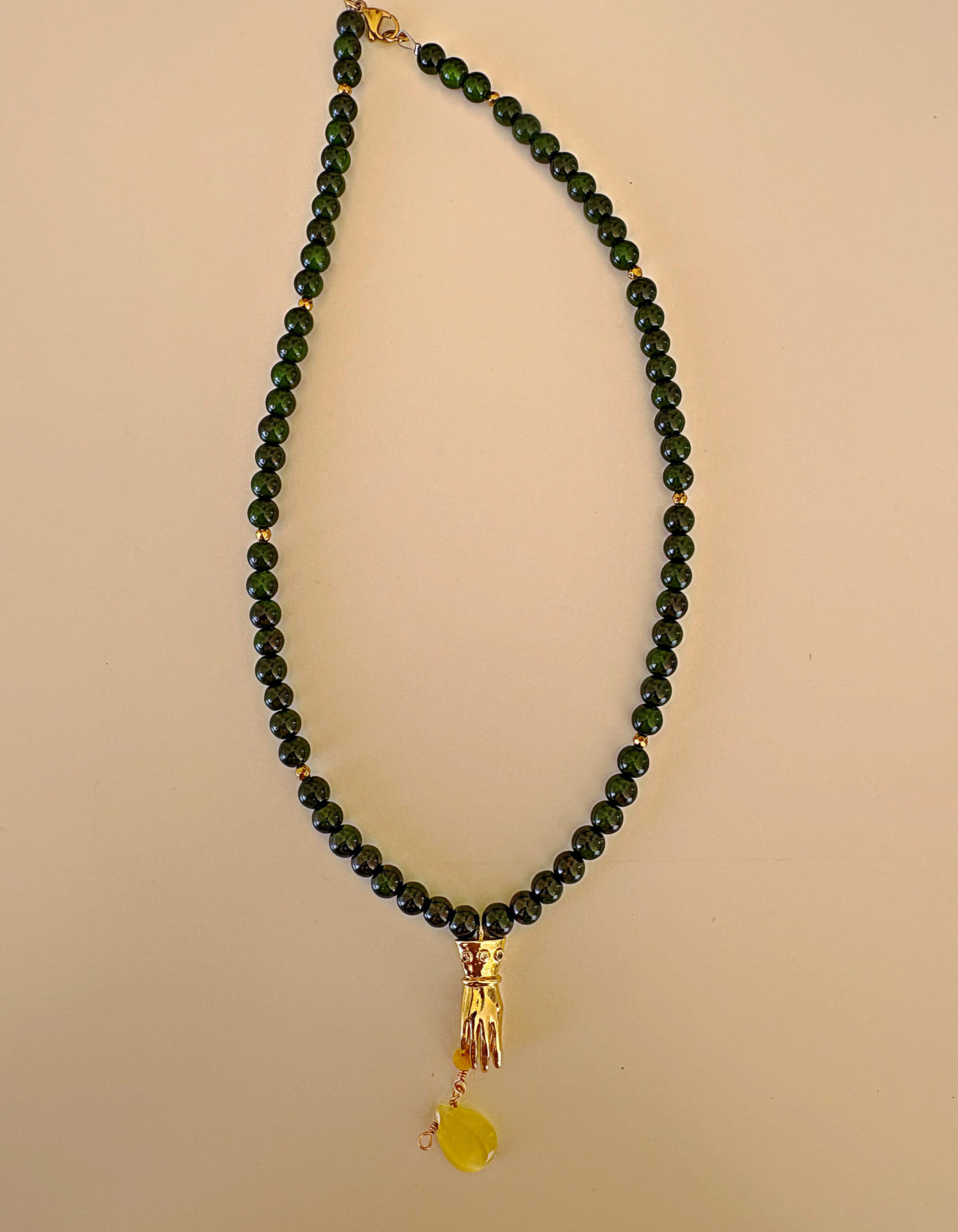 Κοντό κολιέ με πράσινες πέρλες με αιματίτες ενδιάμεσα και μενταγιόν χρυσό γάντι που κρατάει ημιπολύτιμες κίτρινες πέτρες.